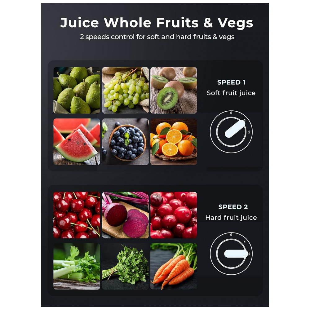 Este espremedor centrífugo Amegat é equipado com um motor em cobre capaz de atingir potência de pico de 1300 W e um filtro de malha de aço inoxidável de alta densidade, permitindo que o suco seja extraído em apenas 4 segundos. Com alto rendimento de suco, este aparelho garante que os nutrientes não sejam destruídos durante a centrifugação em alta velocidade. A calha de alimentação com boca larga de 3,2 permite inserir frutas inteiras, reduzindo o tempo de preparo. Este espremedor possui dois modos de velocidade para diferentes tipos de frutas e vegetais. Todas as peças são fáceis de desmontar e limpar, e o copo de suco contém um separador de espuma em seu interior, garantindo o sabor puro e sem espuma. O design de segurança inclui um braço de travamento de segurança e proteção contra superaquecimento. O pacote inclui o espremedor, jarro de suco, empurrador de alimentos, escova de limpeza, manual e receita de espremedor.