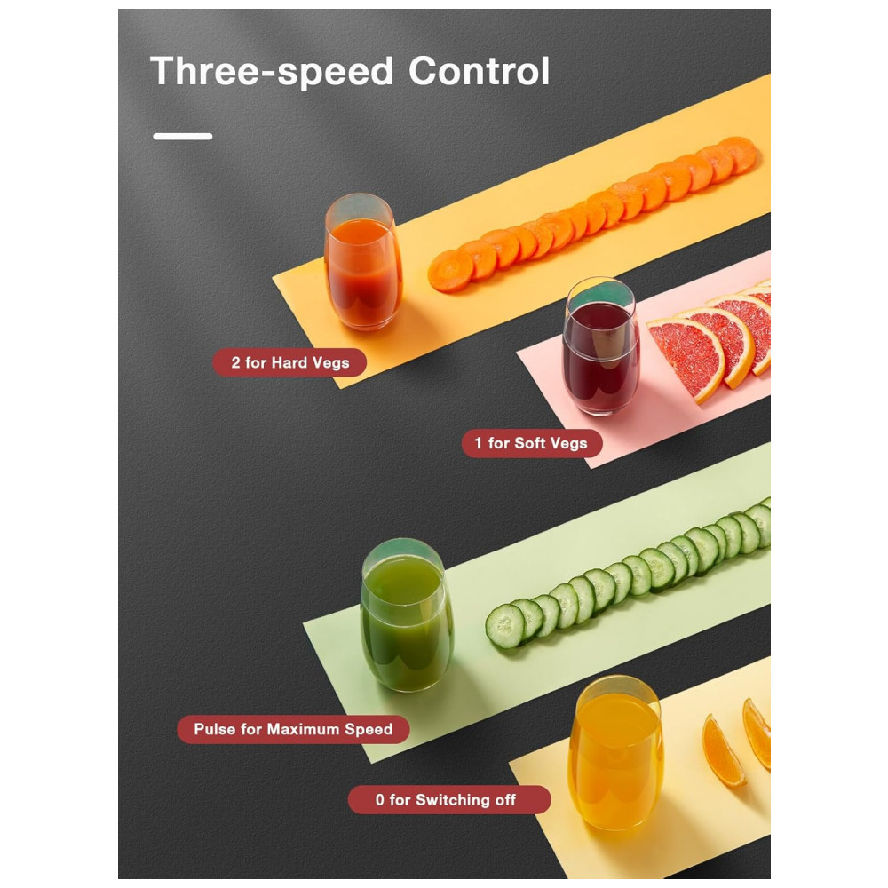 Ele ainda possui três funções de velocidade, sendo a primeira para frutas macias, a segunda para alimentos duros e a terceira para a velocidade máxima. Com acabamentos em aço inoxidável e um design elegante e moderno, este espremedor é seguro, com proteção automática contra superaquecimento e uma trava de segurança dupla para operação segura. O design antiderrapante garante estabilidade durante o uso.