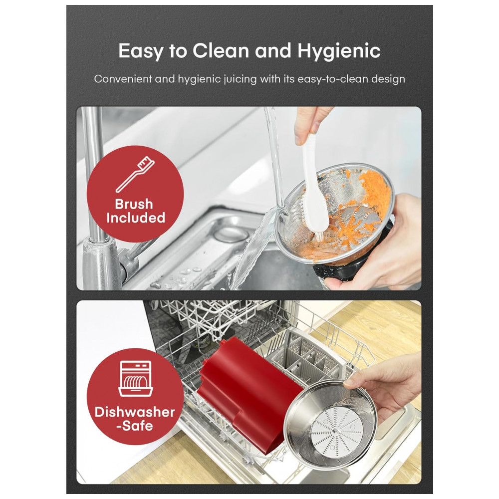 Com um design compacto, este espremedor ocupa pouco espaço na bancada e é fácil de usar, com controle de um botão e montagem simples. A limpeza também é fácil, graças à escova para limpar o filtro de suco e aos acessórios próprios para lava louças, livres de BPA e PFOAs.