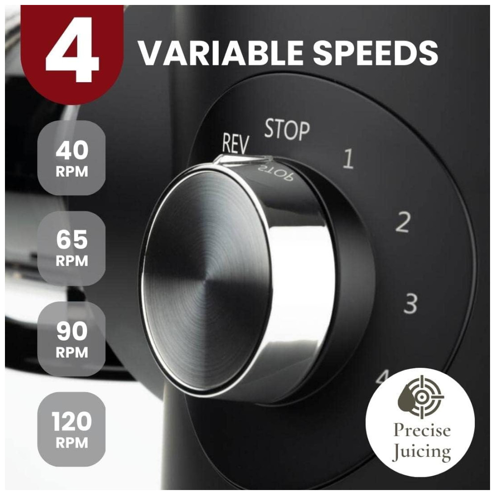 QUATRO VELOCIDADES VARIÁVEIS O Sana 727 oferece quatro configurações de velocidade que variam de 40 rpm a 120 rpm. Velocidades mais baixas minimizam a espuma e a oxidação, são mais suaves e precisas e são melhores para produtos macios ou fibrosos