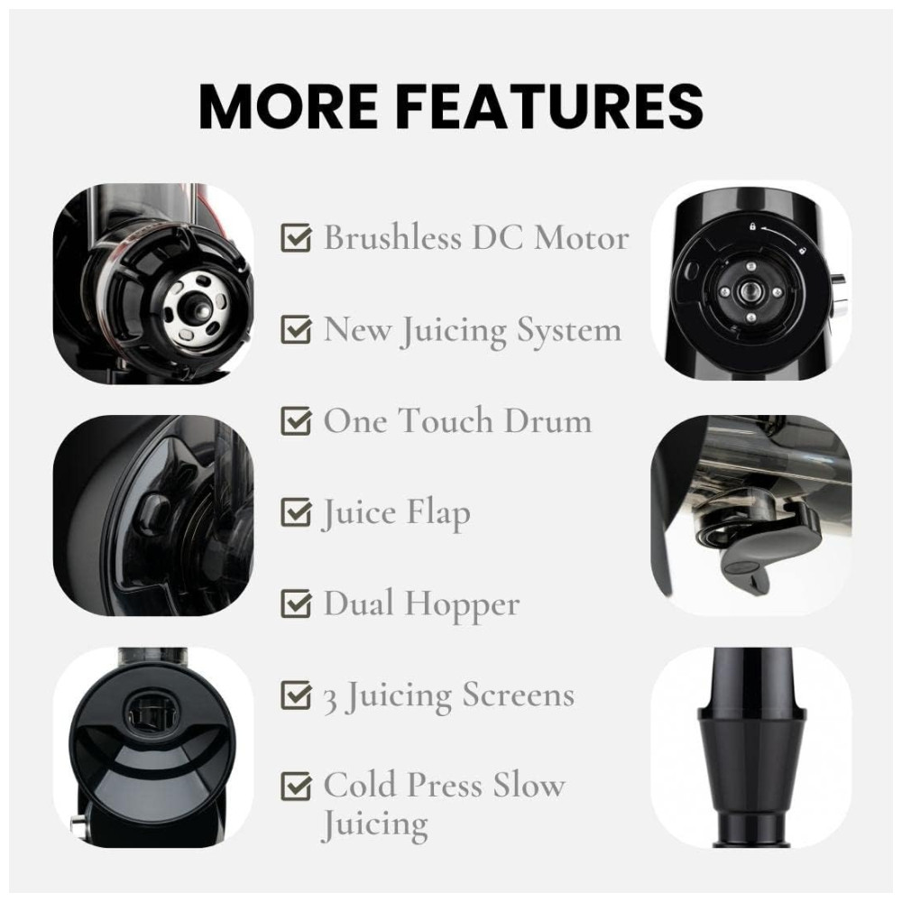 SISTEMA DE IMPRESSÃO A FRIO A tela de sucos fina oferece o maior rendimento de suco. A tela de suco grosso tem menos pressão, permitindo que frutas mais macias sejam espremidas. O cone em branco para funções sem suco permite que você faça manteigas e leites de nozes totalmente naturais, sorvetes, comida para bebês, sobremesas congeladas e muito mais.