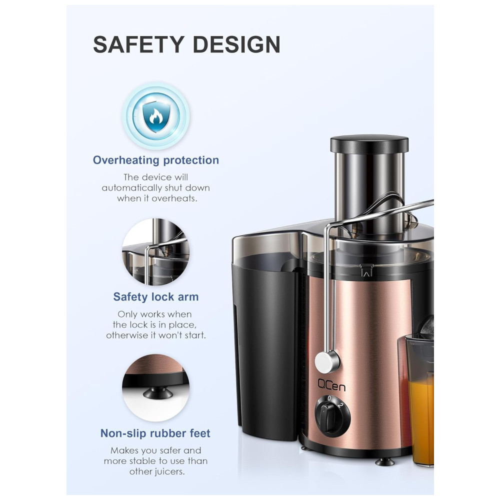 Esta máquina de espremedor centrífugo possui um motor atualizado de alta velocidade de 500 W, mais eficiente e potente do que o fabricante de espremedor de prensa a frio, o que garante uma durabilidade superior em relação a outros concorrentes. Com três bocas largas, esta máquina economiza tempo ao cortar frutas e vegetais em pequenos pedaços. Além disso, conta com controle de duas velocidades 12000 18000 RPM, sendo a velocidade baixa ideal para frutas macias e vegetais como melancia, laranja e morango, enquanto a velocidade alta é indicada para algumas frutas e vegetais mais duros, como cenoura, aipo, maçã e pêra. O design de segurança desta máquina possui um sistema de travamento com braço, que não funcionará sem a tampa travada no lugar. O sistema de proteção contra sobrecarga desliga a máquina assim que ocorrer superaquecimento. As peças removíveis facilitam a limpeza.