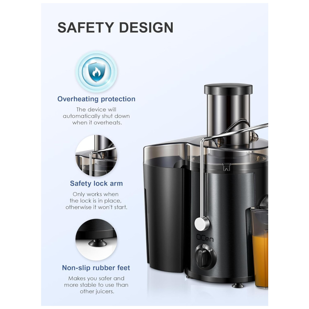 Esta máquina de espremedor centrífugo possui um motor atualizado de alta velocidade de 500 W, mais eficiente e potente do que o fabricante de espremedor de prensa a frio, o que garante uma durabilidade superior em relação a outros concorrentes. Com três bocas largas, esta máquina economiza tempo ao cortar frutas e vegetais em pequenos pedaços. Além disso, conta com controle de duas velocidades 12000 18000 RPM, sendo a velocidade baixa ideal para frutas macias e vegetais como melancia, laranja e morango, enquanto a velocidade alta é indicada para algumas frutas e vegetais mais duros, como cenoura, aipo, maçã e pêra. O design de segurança desta máquina possui um sistema de travamento com braço, que não funcionará sem a tampa travada no lugar. O sistema de proteção contra sobrecarga desliga a máquina assim que ocorrer superaquecimento. As peças removíveis facilitam a limpeza.