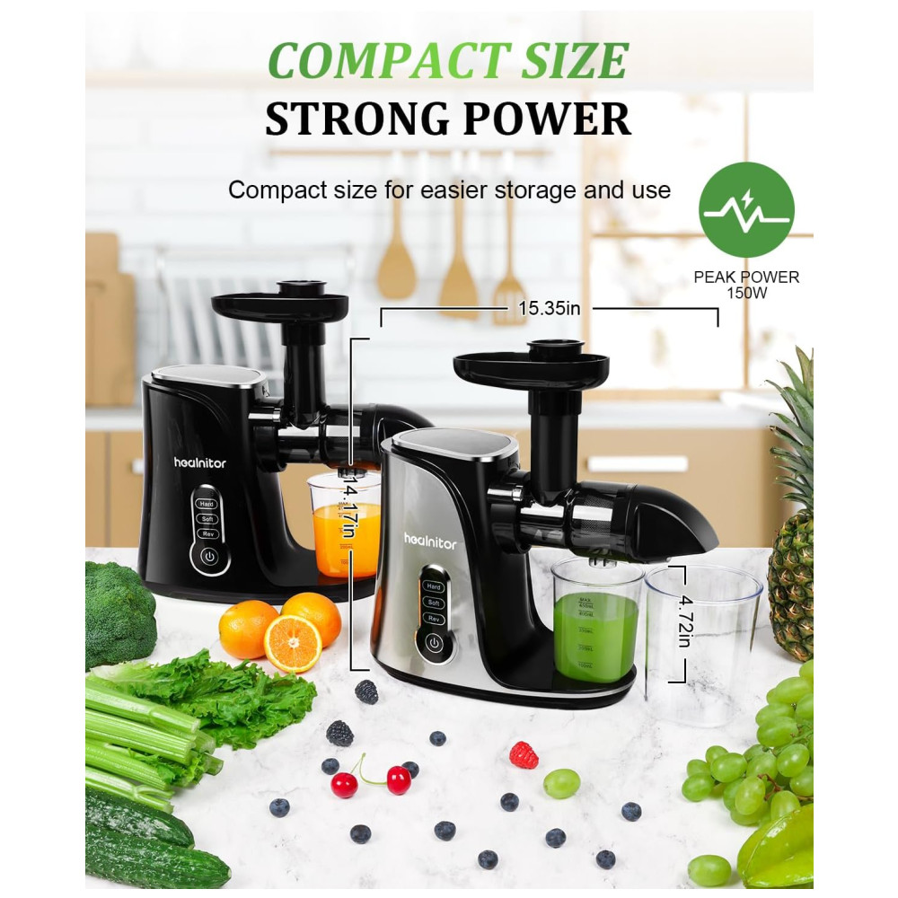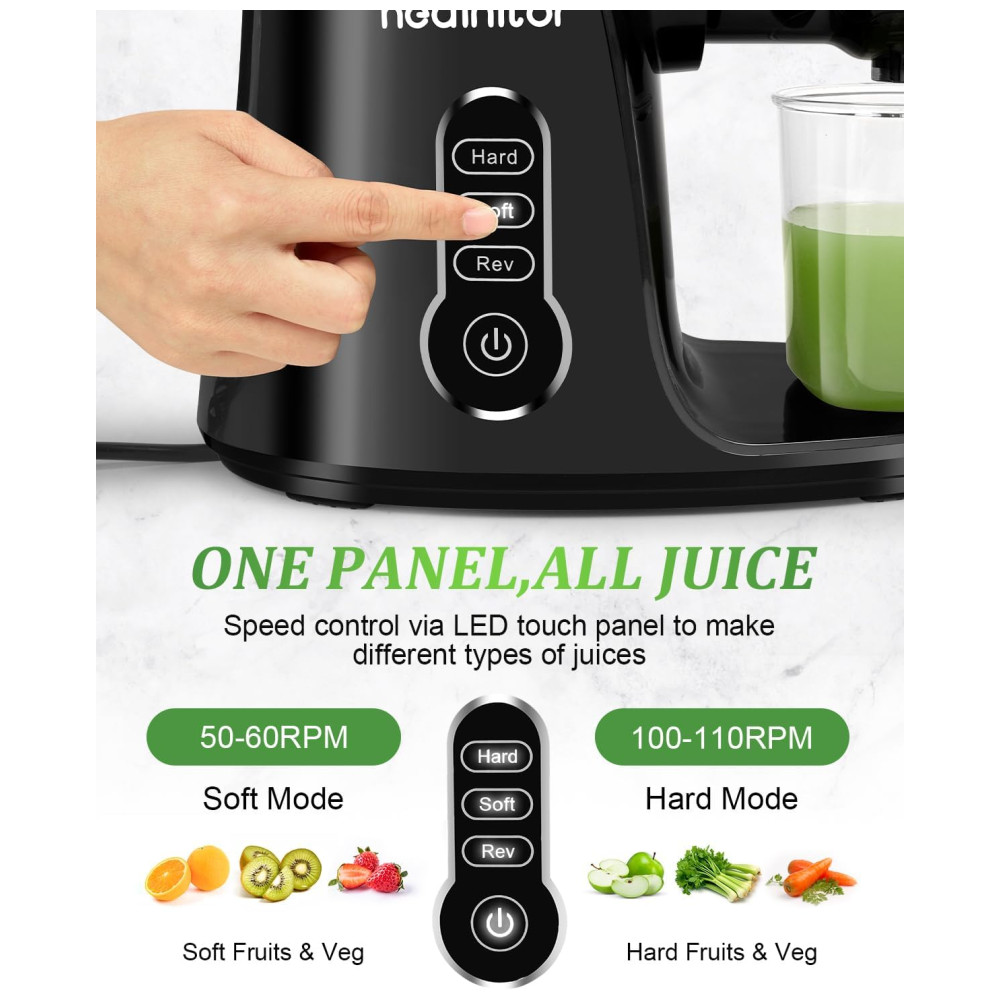 Tela sensível ao toque LED elegante com modo triplo Desfrute de uma operação rápida e fácil com o impressionante painel de toque LED do espremedor lento Healnitor. O modo SOFT é perfeito para frutas e legumes macios, como melancia, laranjas e uvas, com 50 a 60 RPM. O modo DIFÍCIL é perfeito para frutas duras, como maçãs, peras, cenouras e beterrabas, que variam de 100 a 110 RPM. E o modo reverso ajuda a evitar a interferência de alimentos.