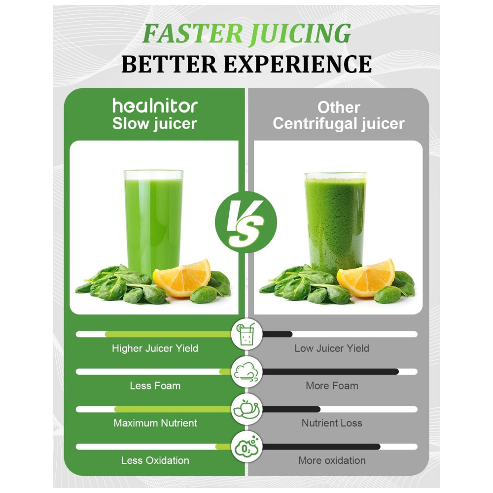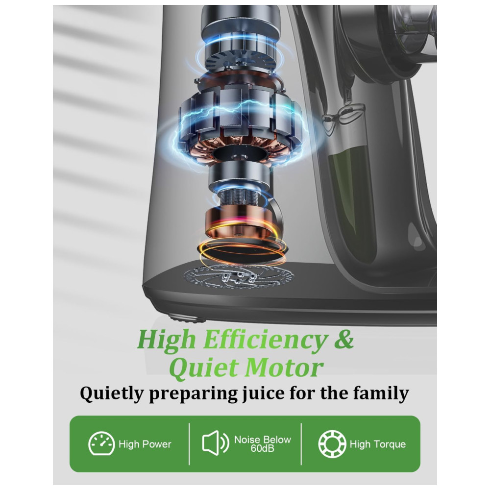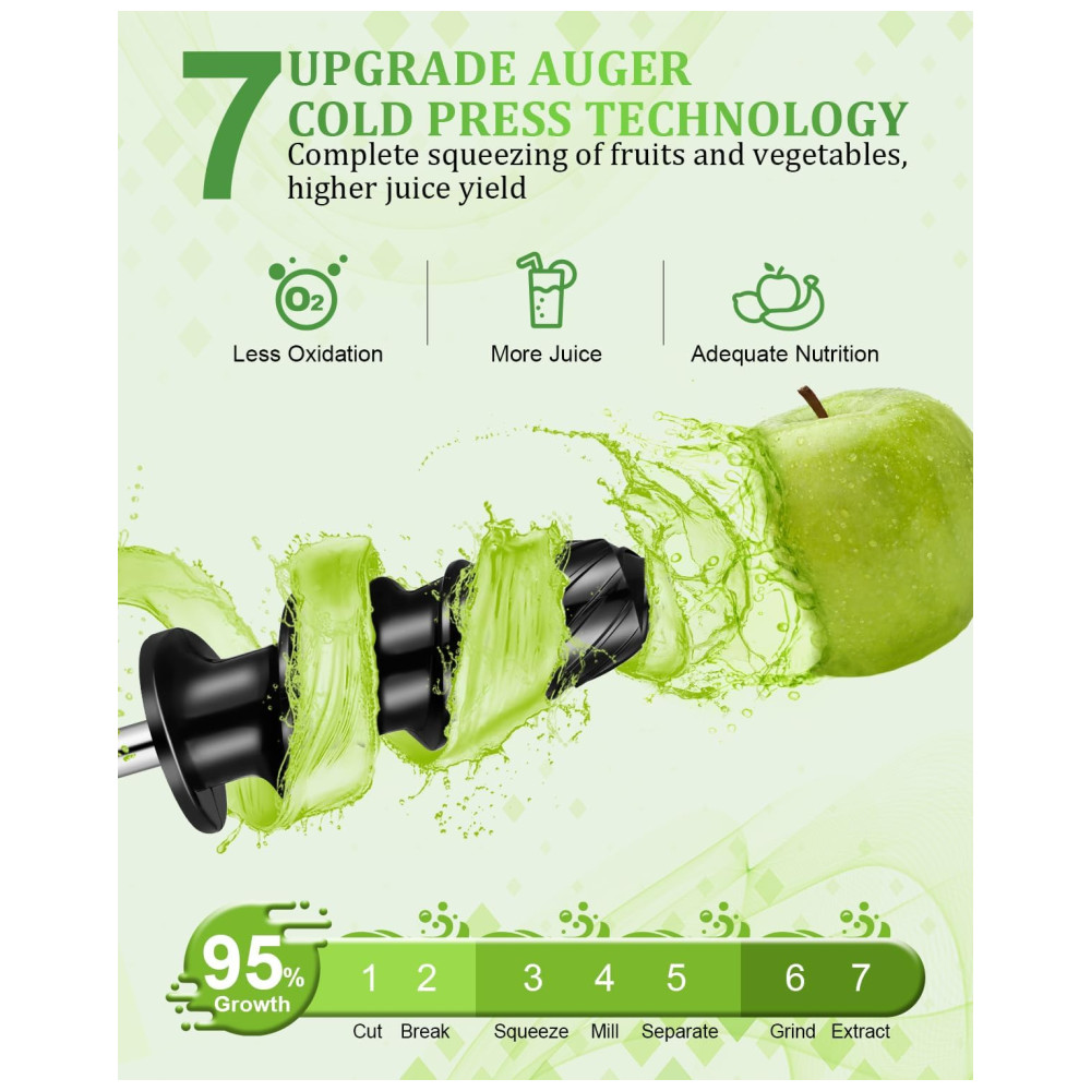 Sistema de prensa a frio de 7 segmentos atualizado Extraia a nutrição e o sabor máximos de suas frutas e legumes com o poderoso motor de 150W e o sistema de mastigação em espiral de 7 segmentos atualizado. Este espremedor de prensa a frio aperta diretamente as frutas e legumes, retendo os nutrientes e minimizando a oxidação para uma frescura mais duradoura.