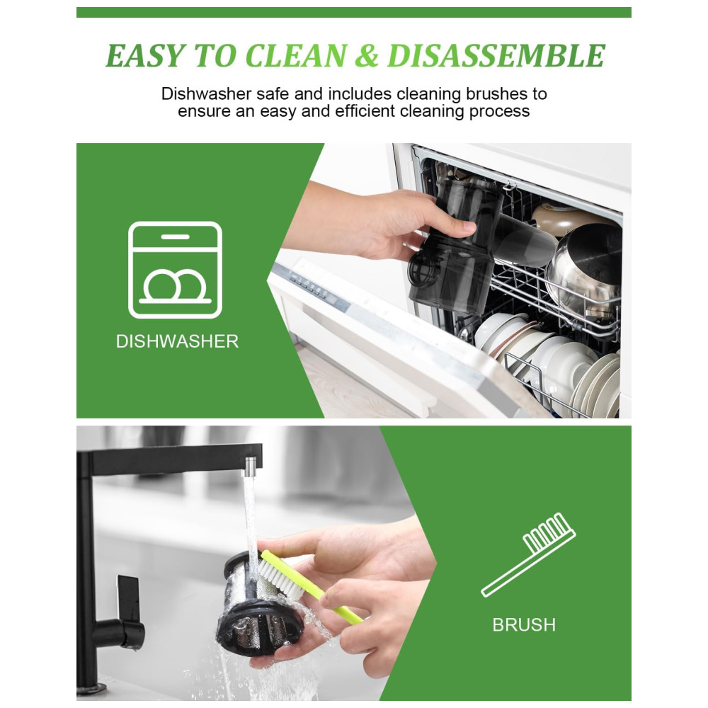 Operação silenciosa e limpeza fácil Aperte as frutas e legumes favoritos da sua família sem perturbar a paz, graças à operação silenciosa do motor a menos de 60 db. O botão de desmontagem com um toque facilita a limpeza, enquanto a escova de limpeza especialmente projetada e as peças removíveis à prova de máquina de lavar louça garantem uma limpeza completa todas as vezes.
