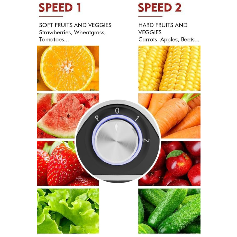 Rendimento de suco Sistema de extração patenteado para maior rendimento de suco a lâmina reforçada de titânio 163 lâminas cortantes e a cesta de filtro de micro malha feita na Alemanha são feitas de aço inoxidável e juntos são projetadas para a melhor extração de suco e nutrientes.