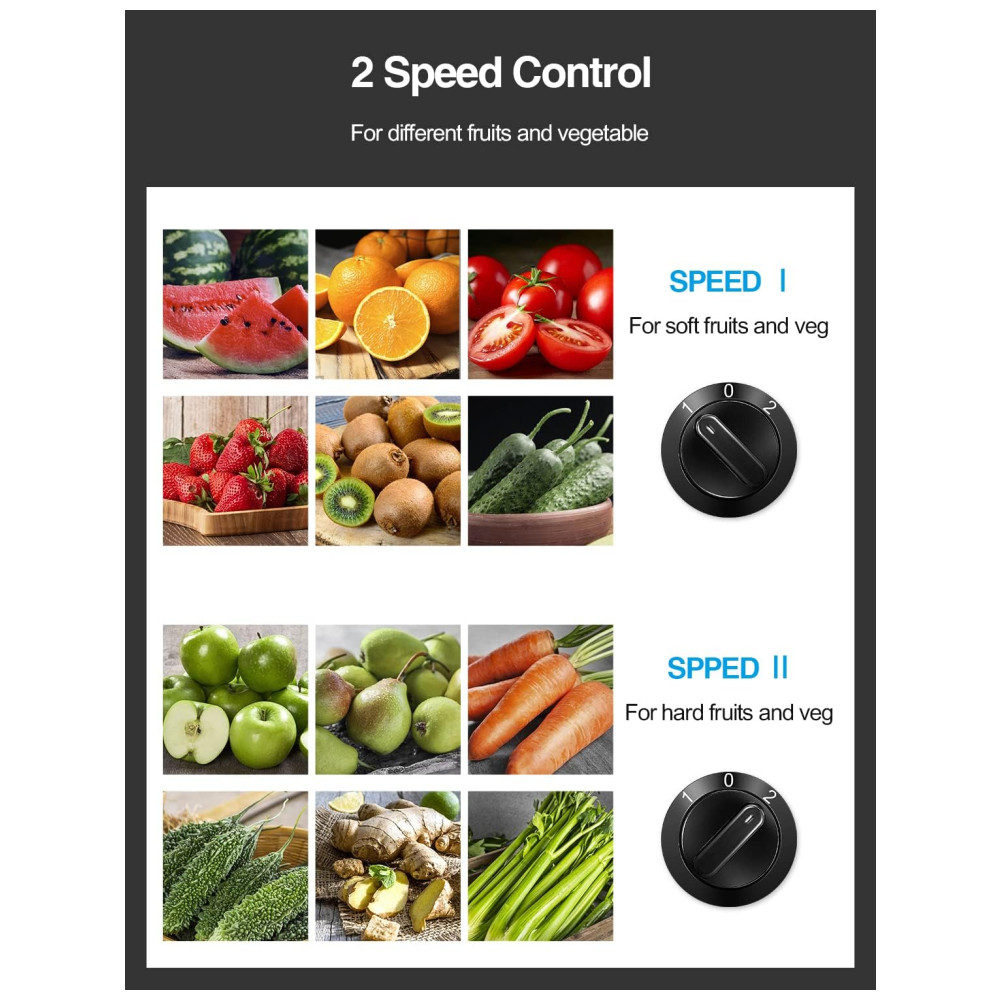 Esta máquina é atualizada com um motor de alta velocidade de 500 W, tornando-a mais eficiente e potente do que os fabricantes de espremedores de prensa a frio. Com bocal largo que mede 7 cm, você economizará tempo cortando frutas e vegetais em pedaços menores. Este espremedor tem controle de 2 velocidades, com uma velocidade baixa para frutas macias como melancia, laranja e morango, e uma velocidade alta para frutas e vegetais duros como cenoura, aipo, maçã e pera. O design de segurança inclui um braço de sistema de travamento e um sistema de proteção contra sobrecarga que desliga a máquina em caso de superaquecimento. As peças removíveis facilitam a limpeza.