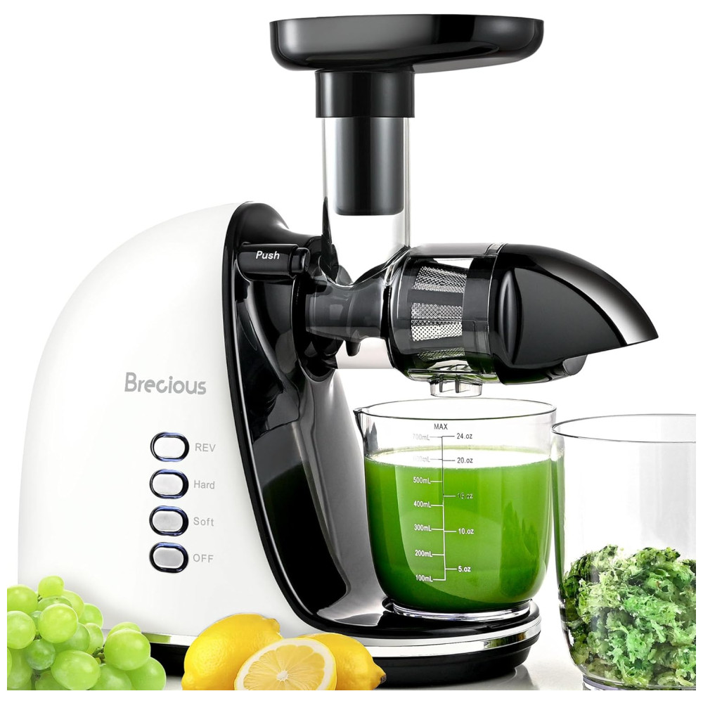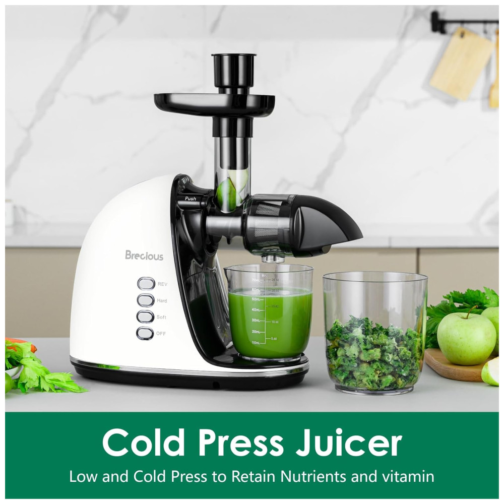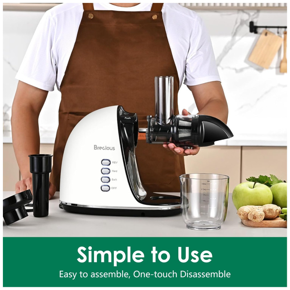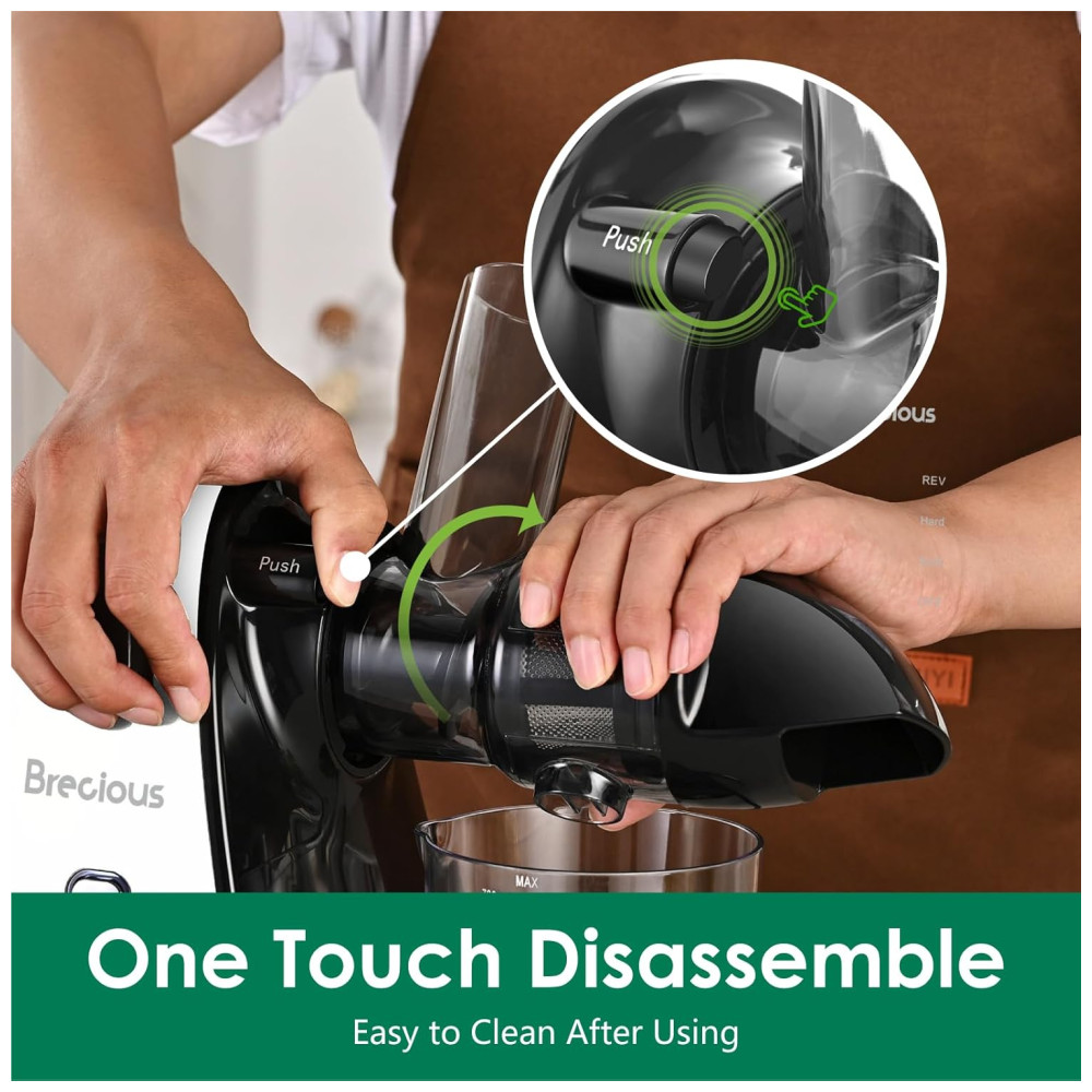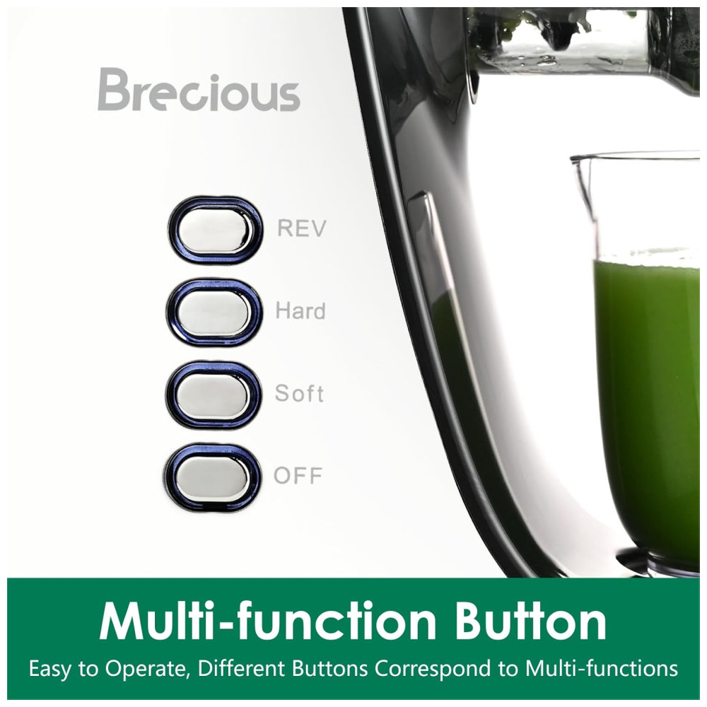 O espremedor de mastigação lenta Brecious apresenta tecnologia de prensagem lenta a frio, com motor potente e silencioso, e alto rendimento de suco de 90%, o que retém mais nutrientes e vitaminas. Com moagem de 7 trados atualizada para rendimento máximo de suco, oxidação mínima e retenção máxima de nutrientes, a máquina possui botões multifuncionais que correspondem a diferentes tipos de alimentos, permitindo escolher o modo de acordo com a dureza das frutas e vegetais para obter sucos de alto rendimento.