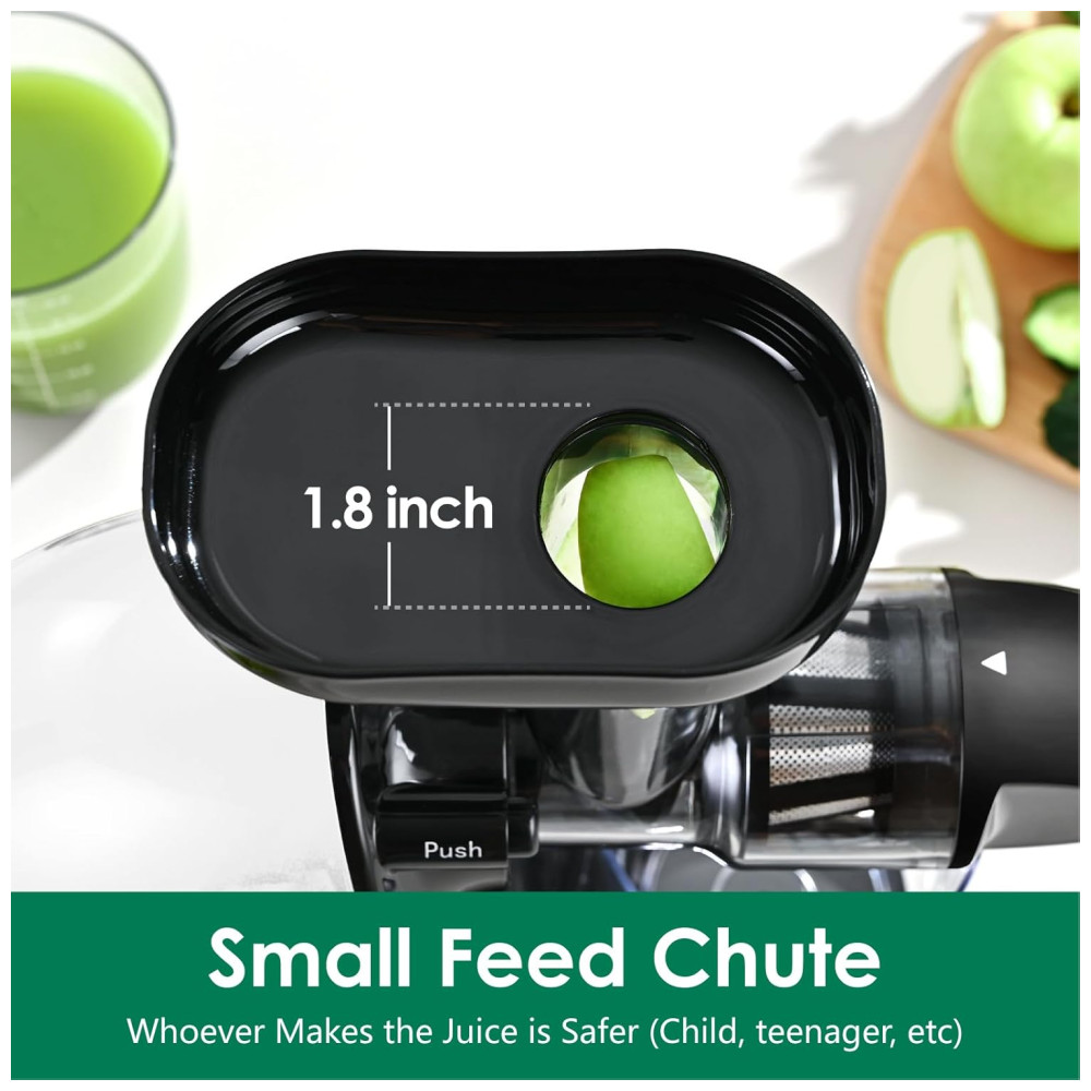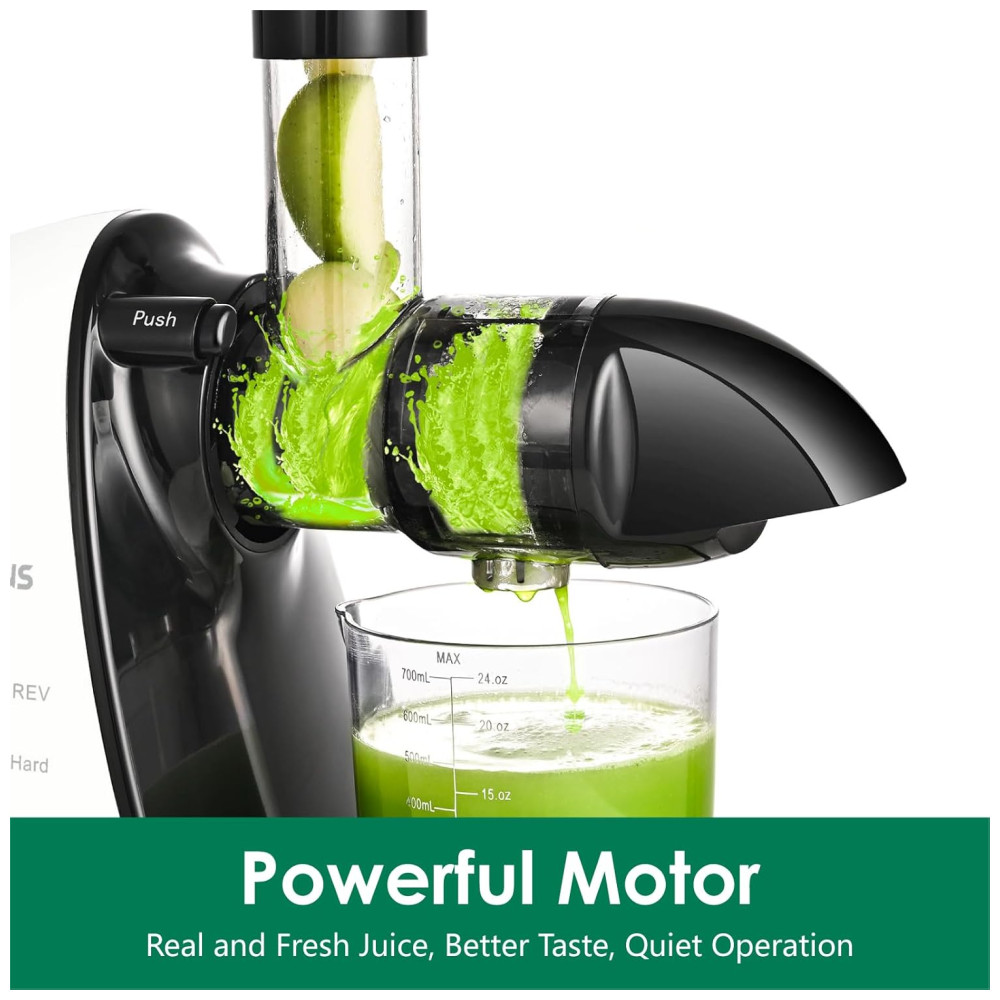 Característica especial: Operação mais silenciosa, 95-110 RPM de baixa velocidade, fácil de limpar, fácil de usar, fácil de montar, sem BPA, motor silencioso, função reversa, alto rendimento de suco para frutas e vegetais, adequado para maçãs verdes, abacaxi, espinafre, salsa, limão e gengibre, couve, grama de trigo, beterraba, manga, tomate, laranja