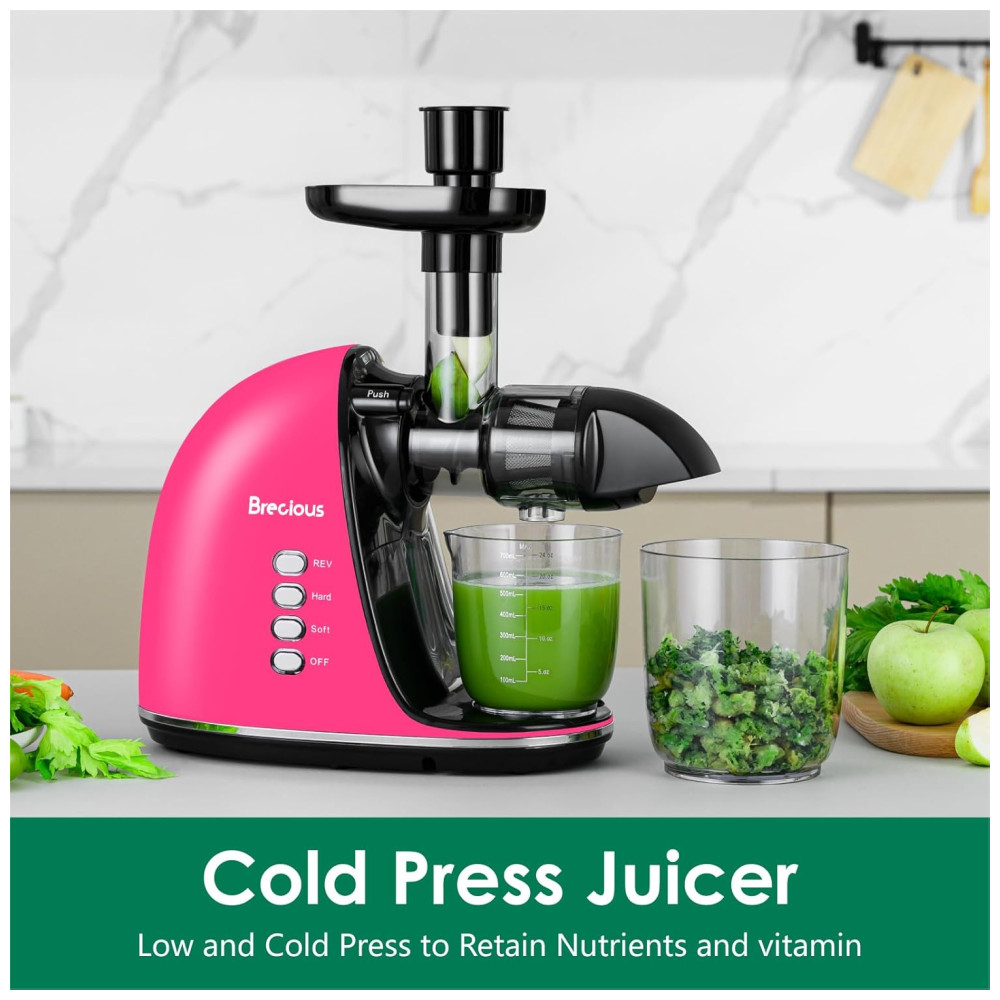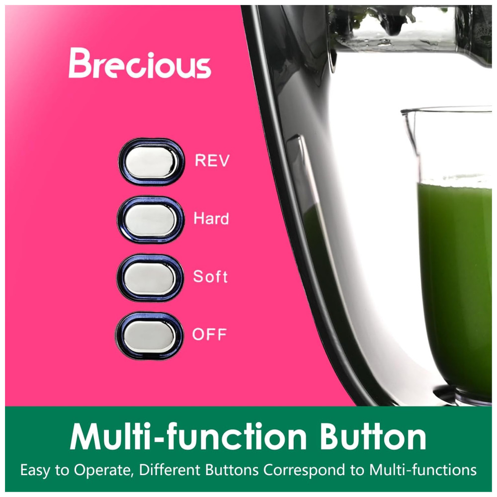 O espremedor de mastigação lenta Brecious apresenta tecnologia de prensagem lenta a frio, com motor potente e silencioso, e alto rendimento de suco de 90%, o que retém mais nutrientes e vitaminas. Com moagem de 7 trados atualizada para rendimento máximo de suco, oxidação mínima e retenção máxima de nutrientes, a máquina possui botões multifuncionais que correspondem a diferentes tipos de alimentos, permitindo escolher o modo de acordo com a dureza das frutas e vegetais para obter sucos de alto rendimento.