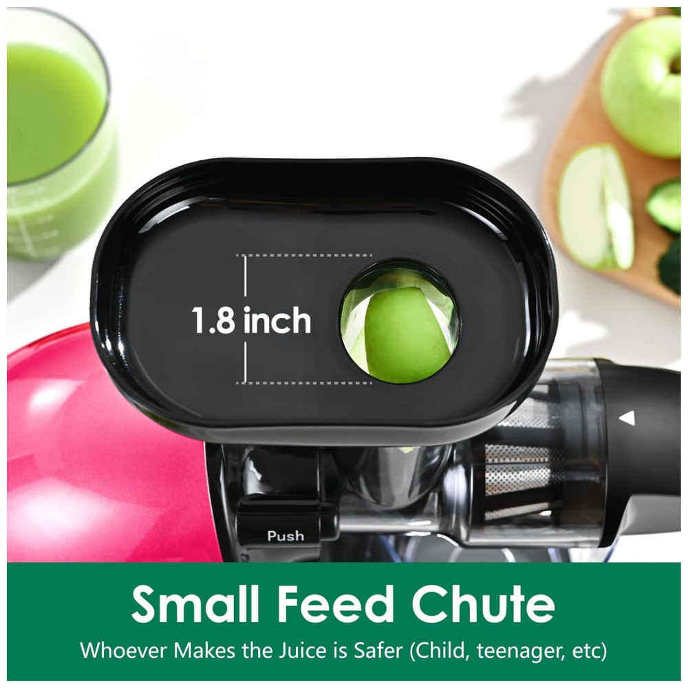 Característica especial: Operação mais silenciosa, 95-110 RPM de baixa velocidade, fácil de limpar, fácil de usar, fácil de montar, sem BPA, motor silencioso, função reversa, alto rendimento de suco para frutas e vegetais, adequado para maçãs verdes, abacaxi, espinafre, salsa, limão e gengibre, couve, grama de trigo, beterraba, manga, tomate, laranja