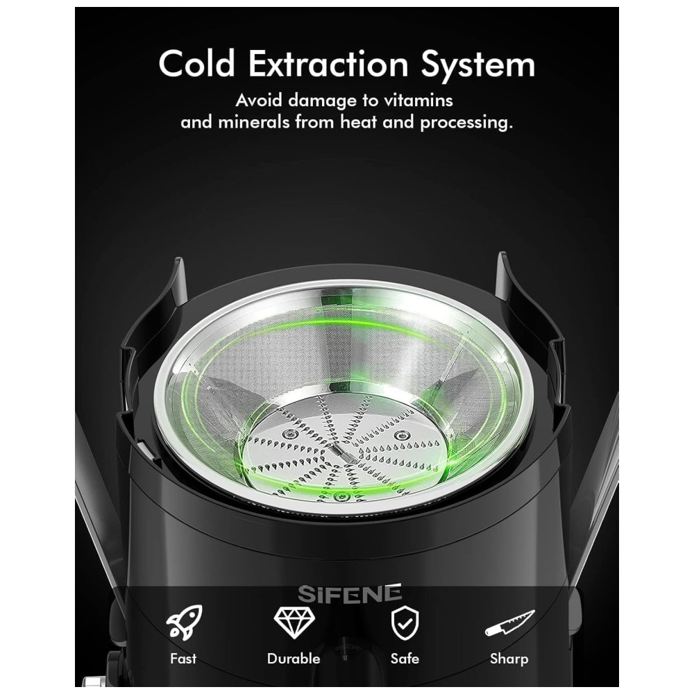 Design de segurança e fácil de limparO extrator de suco prioriza a segurança e a limpeza fácil. Ele funciona apenas quando travado com segurança e desliga automaticamente se estiver sobrecarregado para evitar superaquecimento. Além disso, todas as peças destacáveis podem ser lavadas na máquina de lavar louça, facilitando a limpeza.