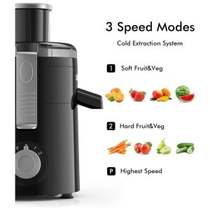 3 Speed Juicer Machine Possui 3 velocidades 12.000 18.000 RPM para lidar com frutas e vegetais macios e duros em apenas cinco segundos. 1 velocidade baixa para frutas e vegetais macios, como melancia, laranja, morango, etc. 7 centimetros velocidade alta para algumas frutas duras e vegetais, como cenoura, maçã, pêra, etc. P é a velocidade mais alta velocidade máxima após a liberação