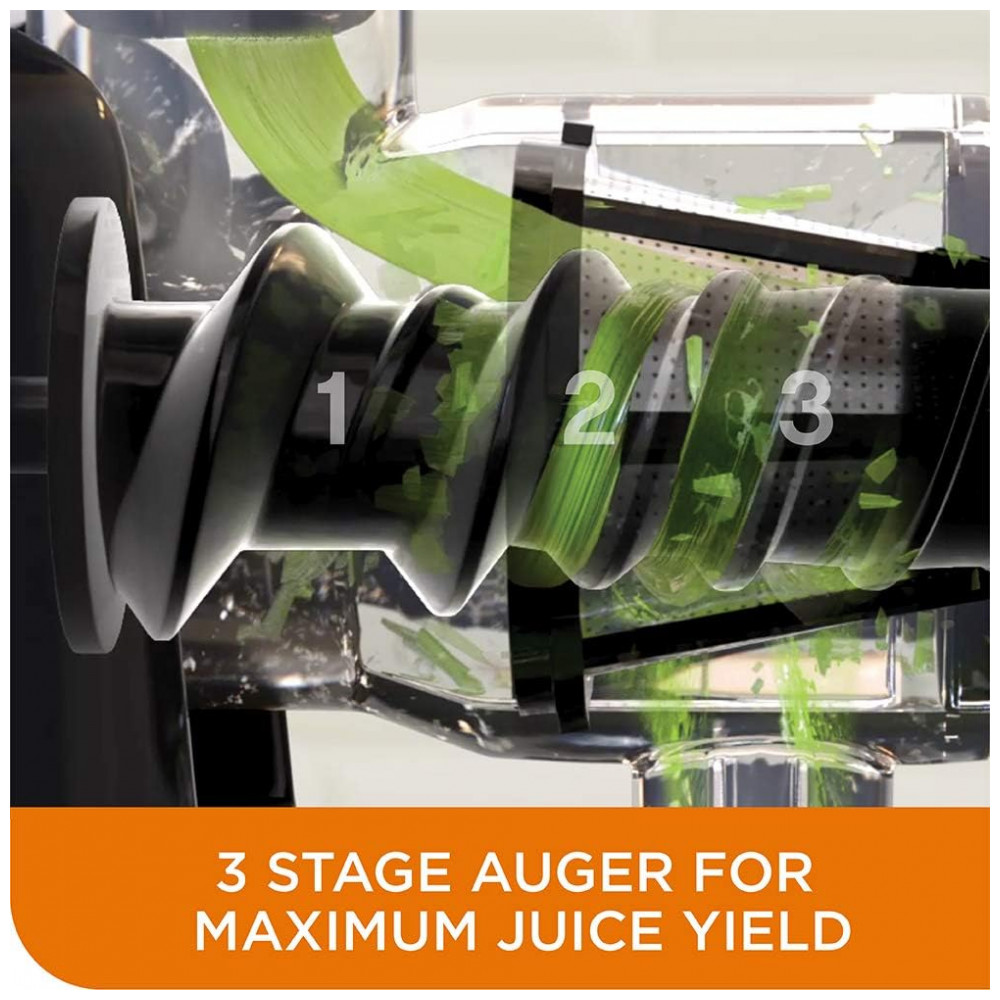 SUCO DE MASTICAÇÃO LENTO DE TRÊS ESTÁGIOS O espremedor de mastigação Choice do chef usa um sem fim de 3 estágios que espreme os alimentos para extrair cada pedaço de suco para maior rendimento e suco de maior qualidade com menos espuma