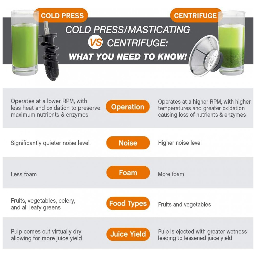 TECNOLOGIA DE PRENSA A FRIO Atinja seus objetivos de estilo de vida saudável com a tecnologia de suco de prensa a frio que elimina o calor e a exposição ao ar para o máximo valor nutricional de vitaminas e minerais em cada copo