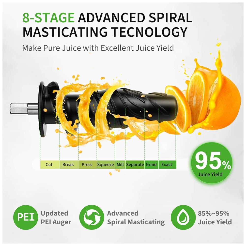 Maior preservação de nutrientes Com a tecnologia de mastigação em espiral de 8 segmentos, as máquinas de espremedor YIOU 80RPM podem preservar o máximo de nutrientes de frutas , vegetais e reduzir a taxa de oxidação. Você pode obter rapidamente um copo de suco com pouca polpa e espuma.