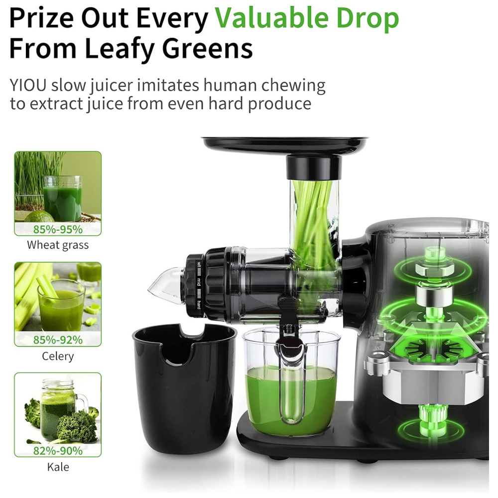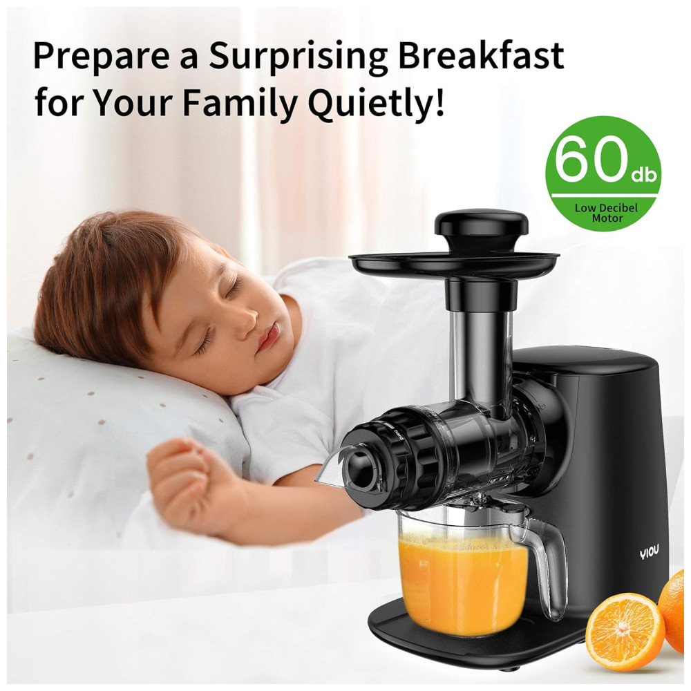 e silencioso O motor premium que pode suportar altas temperaturas de até 250 F e o sistema supereficiente de dissipação de calor com 3 aberturas de ventilação garantem um ambiente de extração de suco . A operação ultra silenciosa das máquinas de espremedor YIOU não afetaria a vida da sua família.