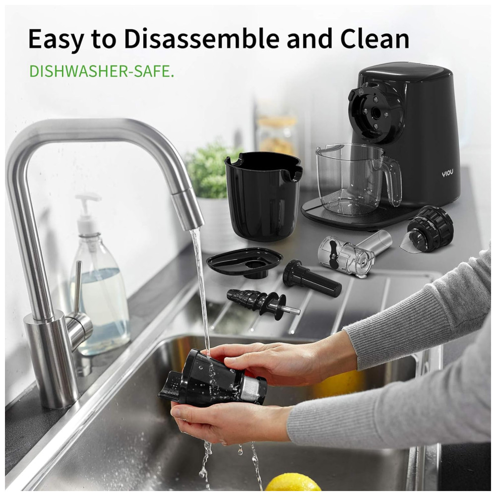 Conveniente e fácil de limpar A função reversa e o sistema de filtragem atualizado podem evitar obstruções e ajudar na limpeza. Uma escova de atualização interna está conectada, a qual pode limpar facilmente o espremedor e o filtro. Todas as peças das máquinas de espremedor YIOU são removíveis e próprias para lava louças