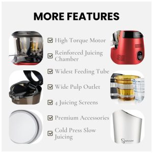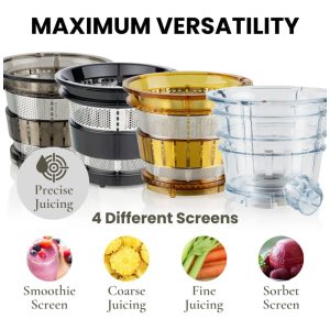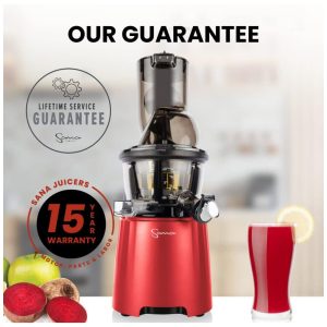 Os espremedores lentos de prensa a frio SANA 868 vêm com um sistema de lâminas de limpeza que limpa efetivamente todas as peças de aço inoxidável. Além disso, o pacote inclui um jarro de suco de vidro de borosilicato temperado extra grande de 1500ml e Recipiente Extra Grande 100% de aço inoxidável de qualidade alimentar.