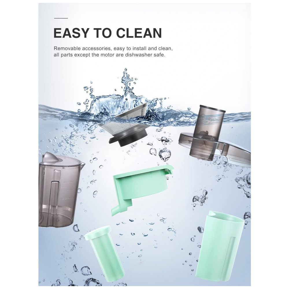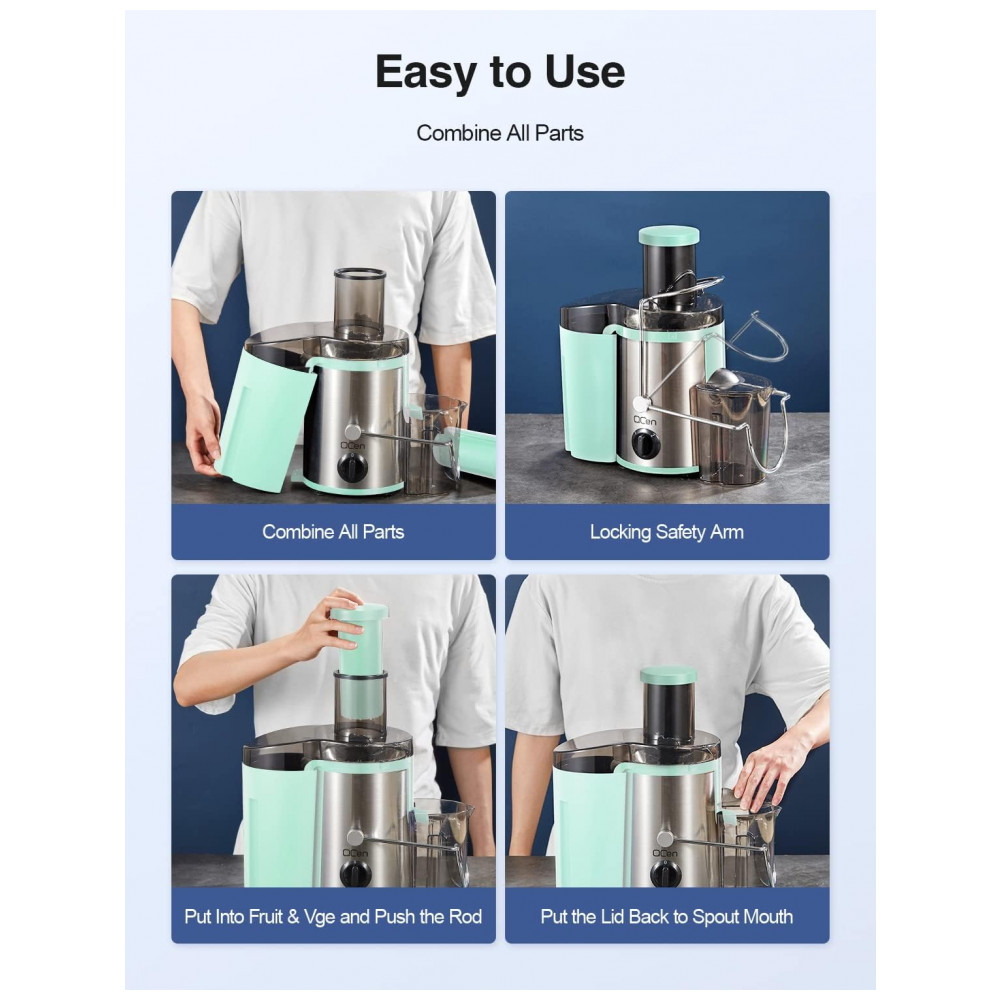 Design de segurança e fácil de limpar Extrator de suco com braço de sistema de travamento, não funcionará sem a tampa travada no lugar. O sistema de proteção contra sobrecarga desligará a máquina assim que ocorrer superaquecimento. Peças removíveis facilitam a limpeza