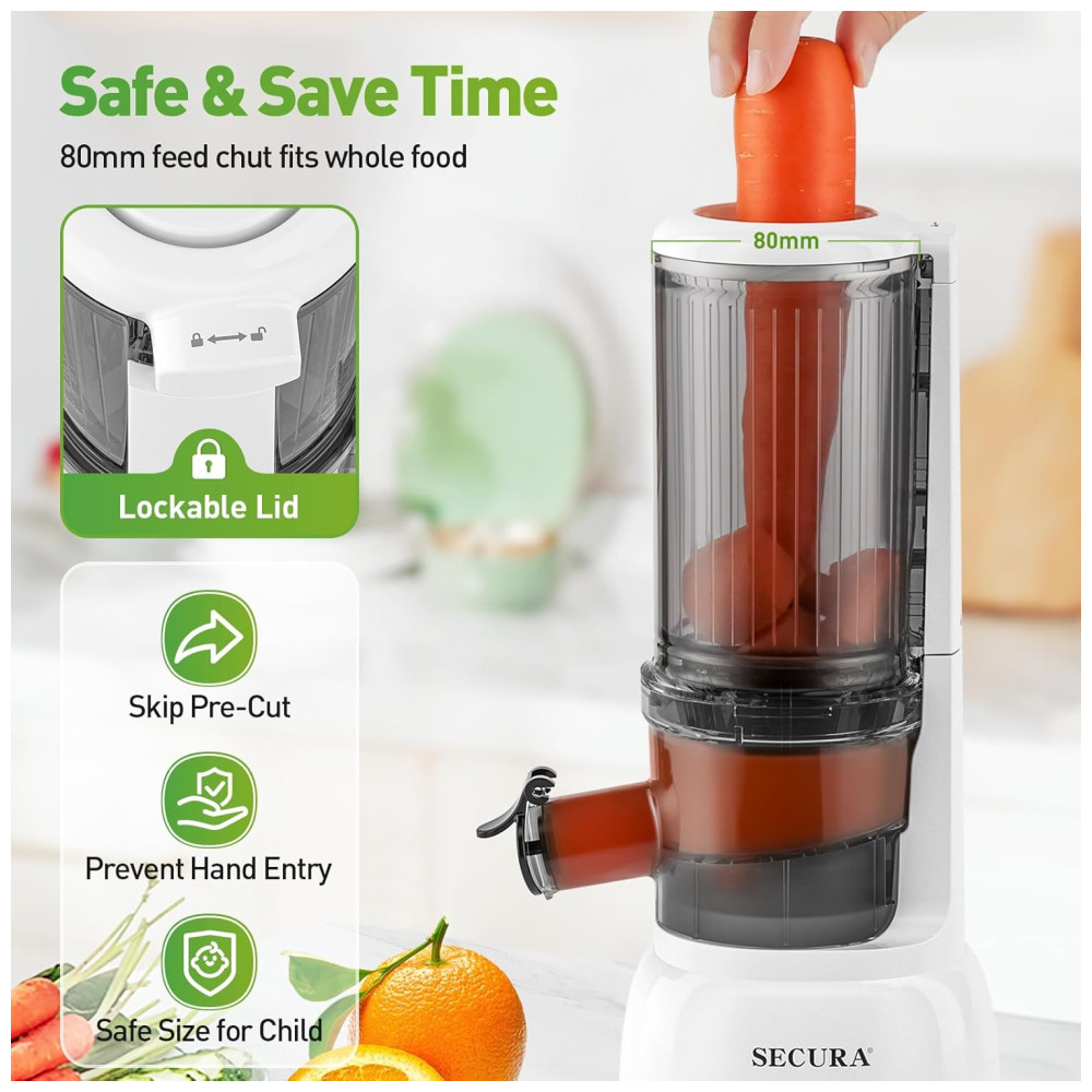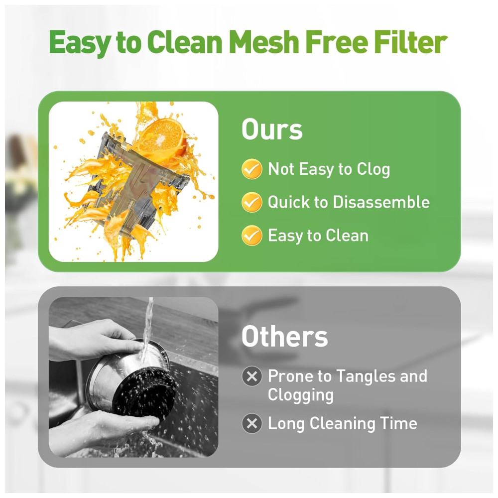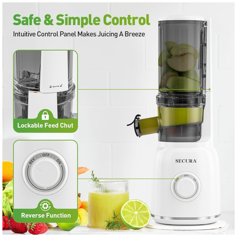 Além disso, a máquina para de funcionar quando você abre a tampa da calha de alimentação, o que é mais seguro para as crianças. O espremedor mastigador Secura tem uma função de reversão e usa um design de filtro sem malha que não é propenso a entupimento e é fácil de montar e limpar. Use a escova especial incluída para limpar facilmente em menos de 5 minutos, ajudando você a conseguir uma limpeza sem preocupações.