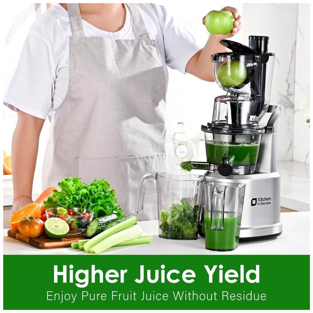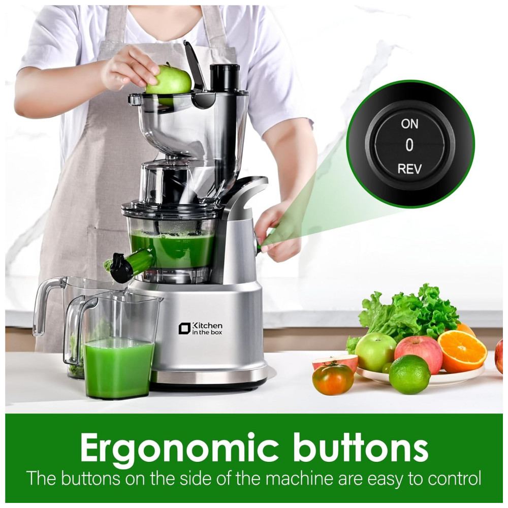 Nossa centrifuga de frutas e espremedor de prensa a frio Kitchen in the Box apresentam uma grande calha de alimentação de 83 mm, permitindo que você esprema facilmente frutas inteiras e em pedaços sem a necessidade de picar. Além disso, a calha de alimentação de 32 mm é perfeita para vegetais longos, proporcionando opções versáteis de sucos. Diga adeus ao preparo demorado e aproveite a praticidade de diferentes combinações de ingredientes para seus sucos.