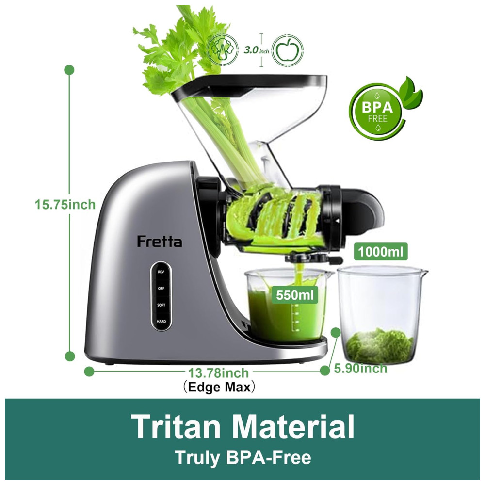 Com um motor DC de 200 W potente e silencioso, a máquina espremedora mastigadora Fretta é capaz de extrair nutrição profunda de suas frutas e vegetais favoritos com níveis de ruído abaixo de 70,0 DB. Além disso, a calha de alimentação em forma de Y seguro evita a inserção acidental da mão e minimiza o risco de possíveis lesões nas mãos.