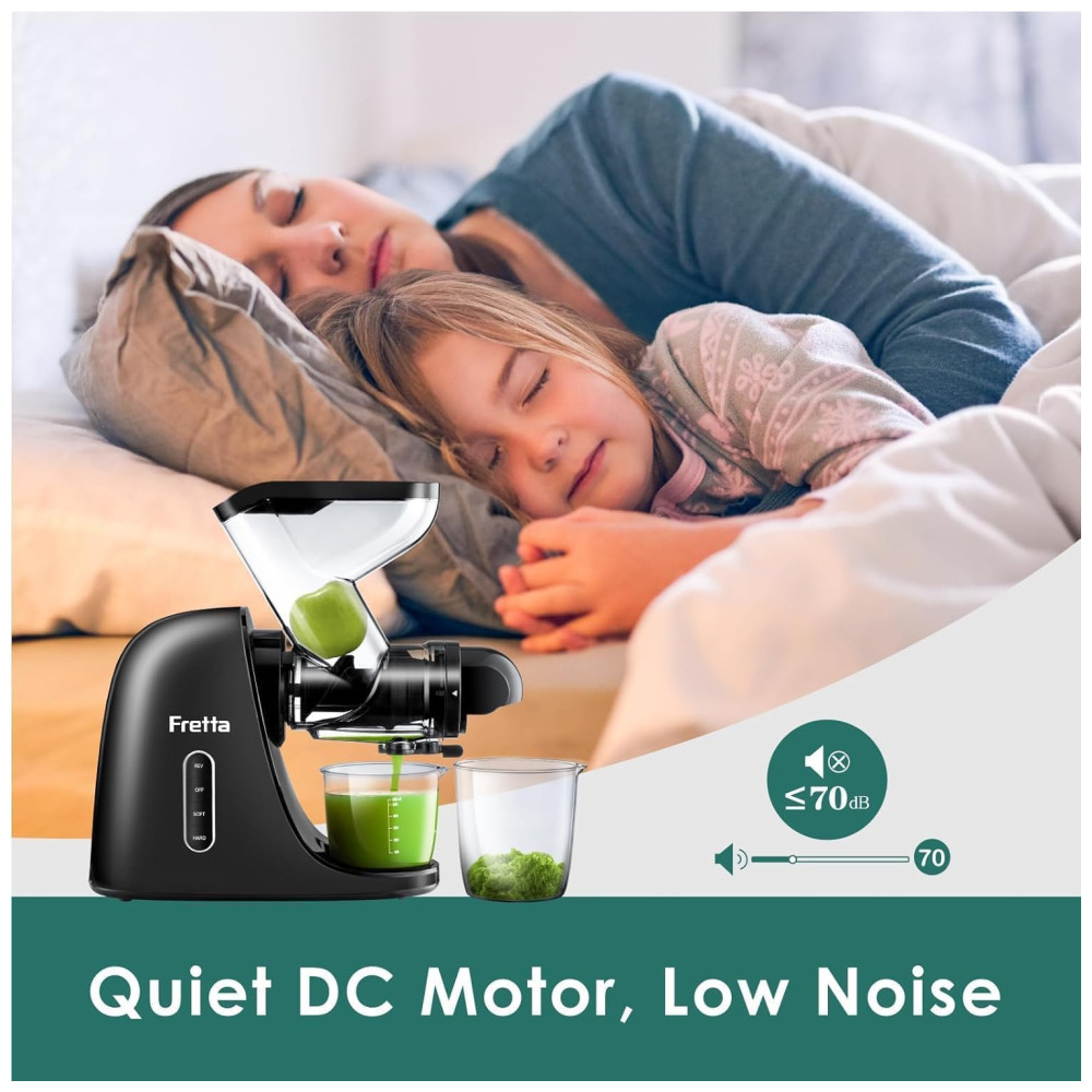 O extrator de sucos Fretta Masticating opera com tecnologia de prensagem fria (cold press) de baixa rotação (80 RPM), preservando nutrientes e reduzindo oxidação. Destaca-se pelo tubo duplo e largo de alimentação (7,6 cm) para inserir frutas e vegetais inteiros, corpo de Tritan livre de BPA, lâminas em inox e design em Y para segurança adicional. Atende dois modos de funcionamento: “Soft” para frutas macias e “Hard” para ingredientes densos (85–110 RPM), além de função reversa anti-entupimento. O motor DC de 200W oferece torque elevado e funcionamento silencioso (70 dB). A montagem é intuitiva, liberando o corpo para limpeza por botão único e inclui escova dedicada. Não possui partes compatíveis com lava-louças.