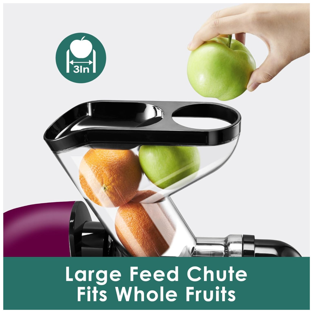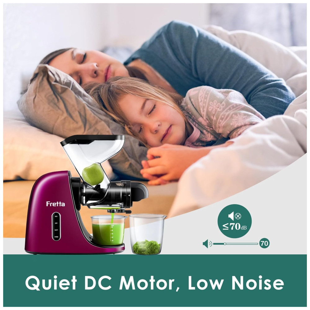 Com um motor DC de 200 W potente e silencioso, a máquina espremedora mastigadora Fretta é capaz de extrair nutrição profunda de suas frutas e vegetais favoritos com níveis de ruído abaixo de 70,0 DB. Além disso, a calha de alimentação em forma de Y seguro evita a inserção acidental da mão e minimiza o risco de possíveis lesões nas mãos.