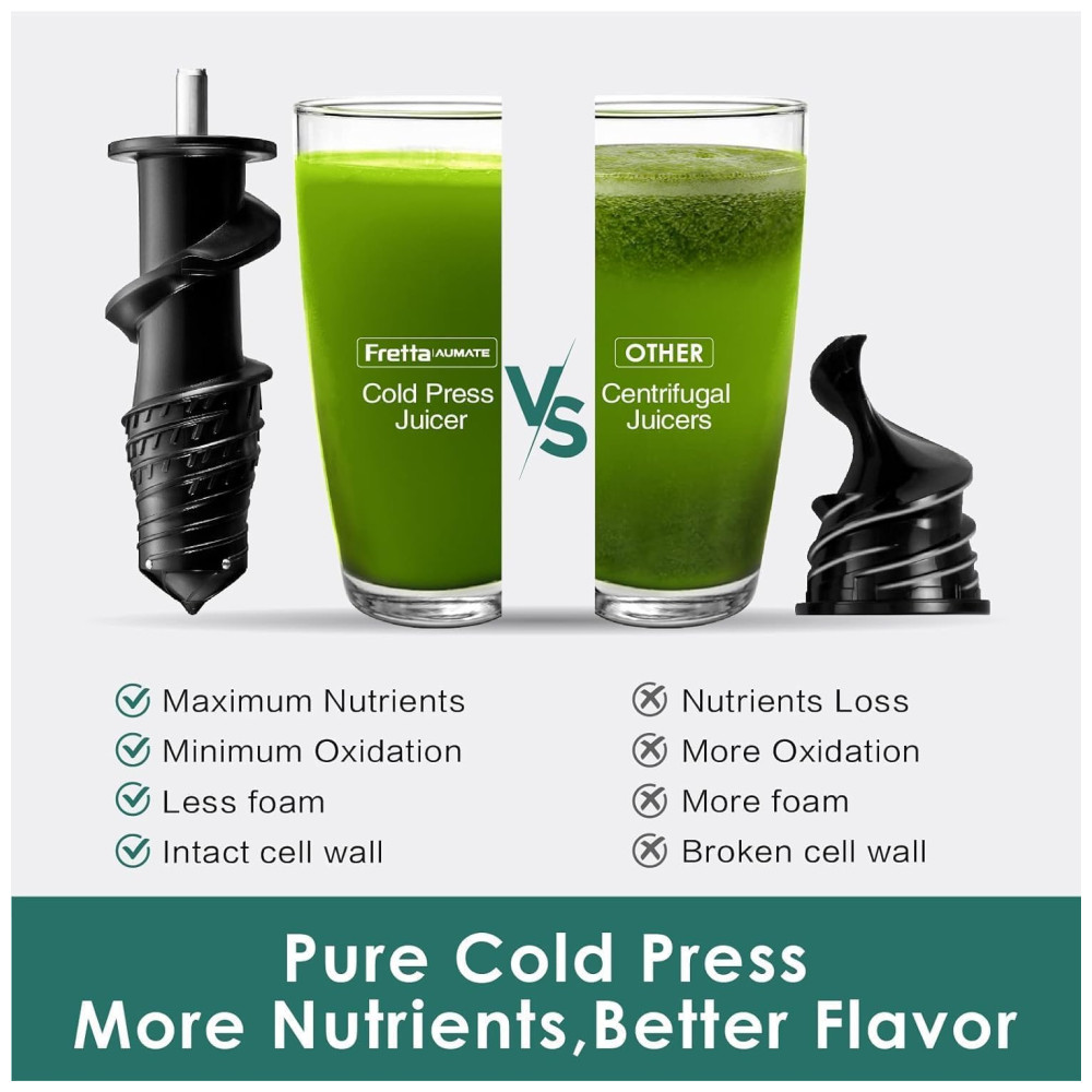 A tecnologia avançada de prensa a frio de baixa velocidade da Fretta permite que as máquinas espremedoras extraiam a quantidade máxima de suco de frutas e vegetais com desperdício reduzido. O processo de prensagem a frio minimiza a oxidação e prolonga o frescor do suco, preservando os nutrientes essenciais e o sabor requintado do seu suco recém prensado.