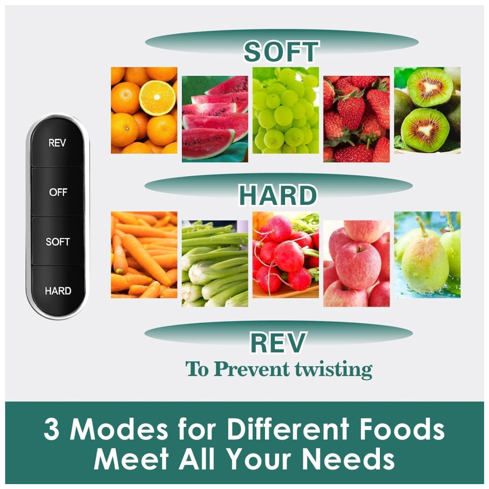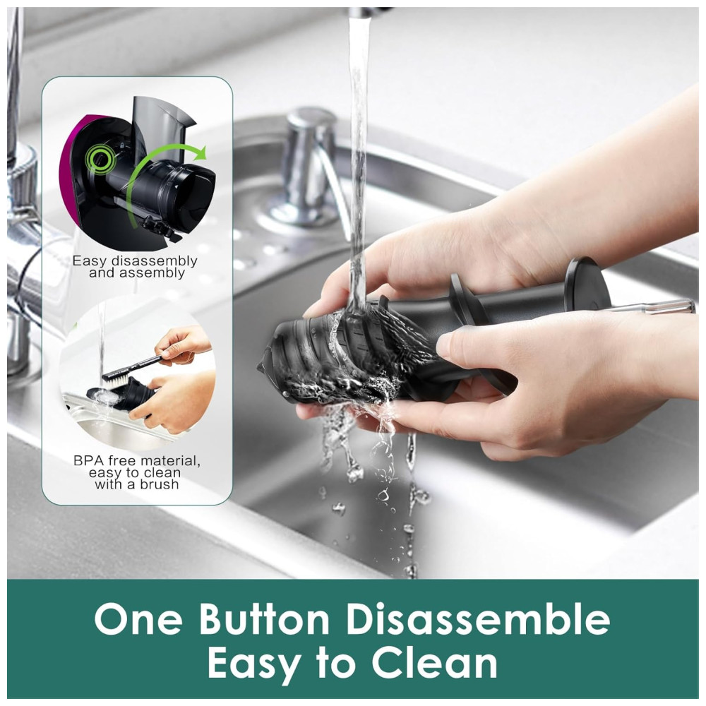 O espremedor lento Fretta é equipado com um design conveniente de calha de alimentação dupla, permitindo adicionar simultaneamente vários ingredientes, economizando tempo e esforço no processo de suco. Com apenas um toque de um botão, o corpo do suco se destaca facilmente, permitindo uma limpeza conveniente em água corrente. A função reversa evita efetivamente o entupimento durante o processo de extração do suco e simplifica a limpeza, garantindo uma experiência tranquila e descomplicada.