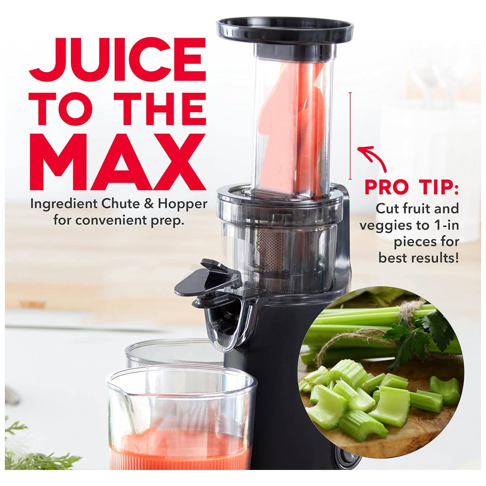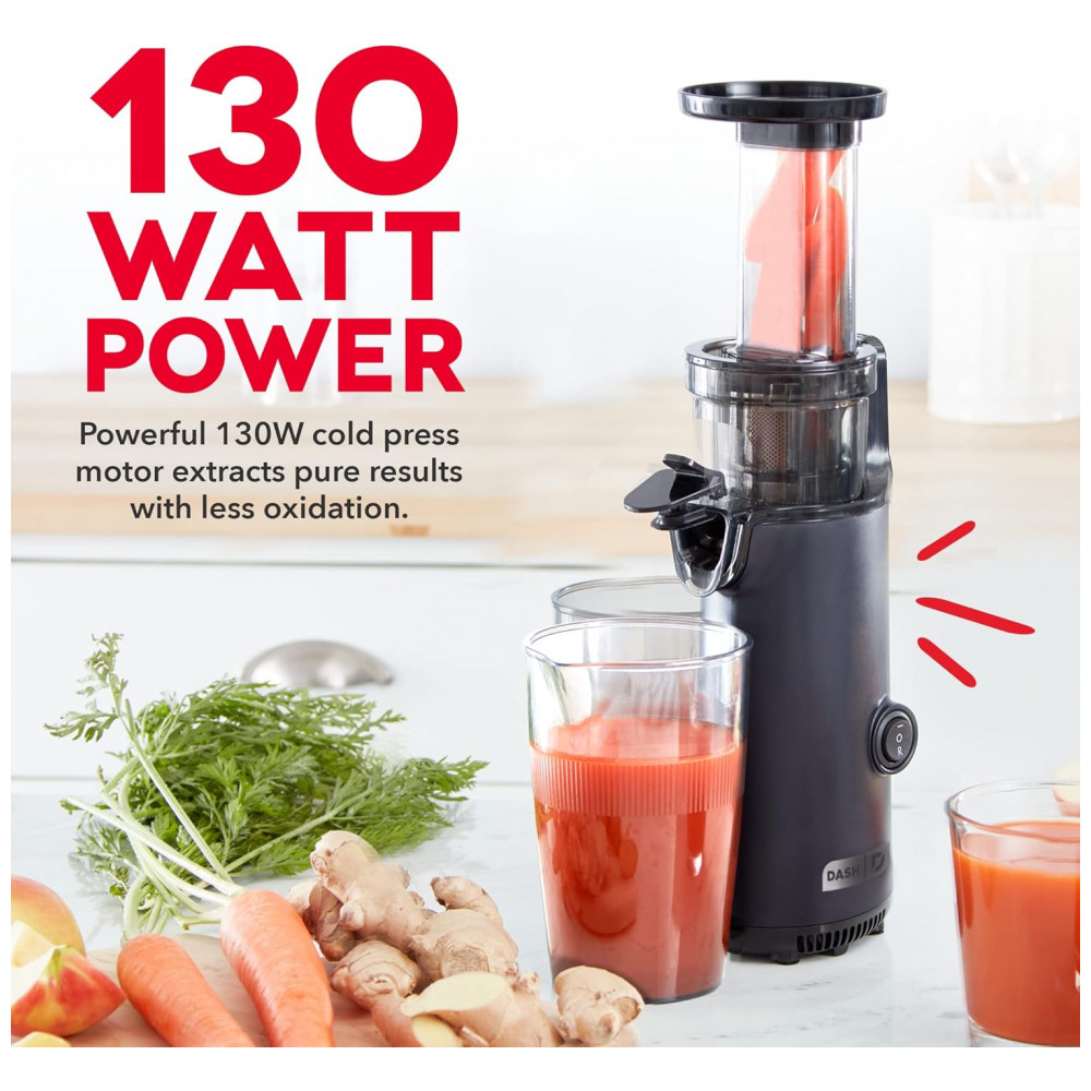 INCLUI Exclusivo da . Dash Deluxe Compact Power Slow Juicer, acessório Frozen, copo medidor de polpa, escova de limpeza e guia de receitas. Comprimento do cabo 88 centimetros, Voltagem 120V.