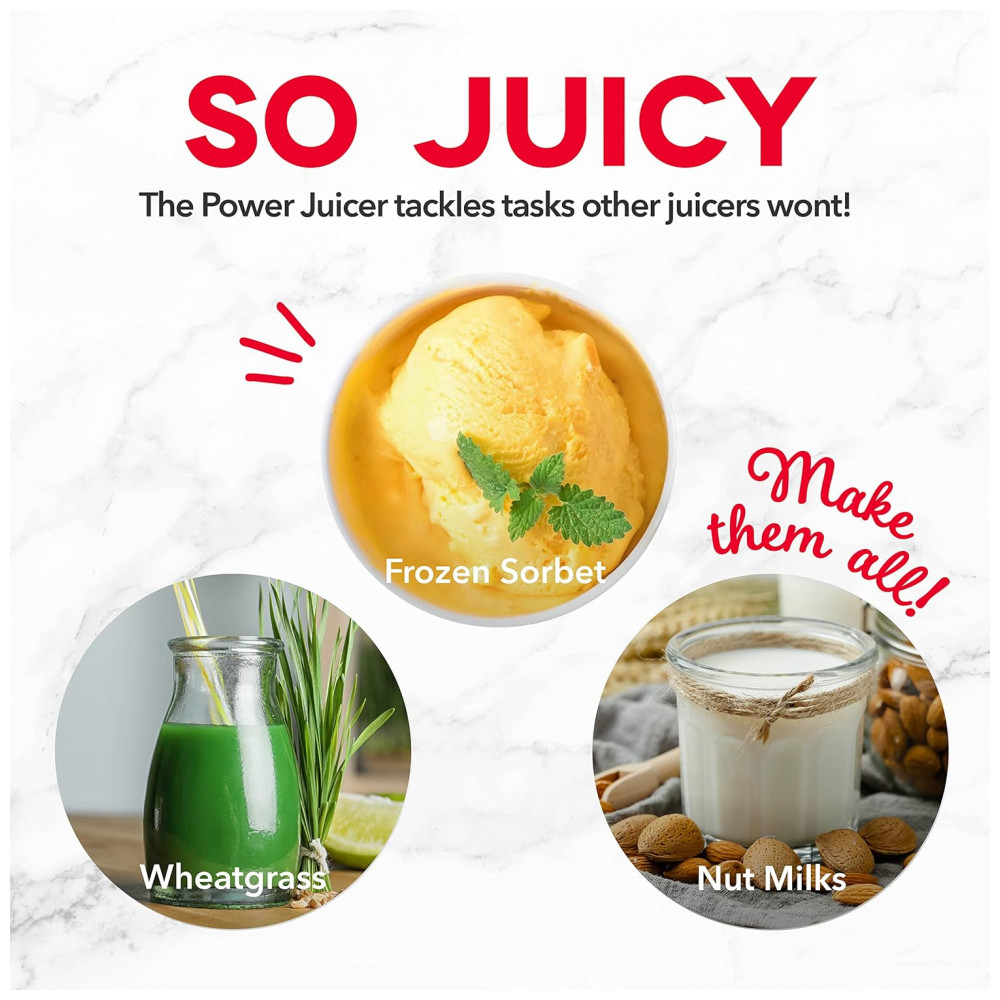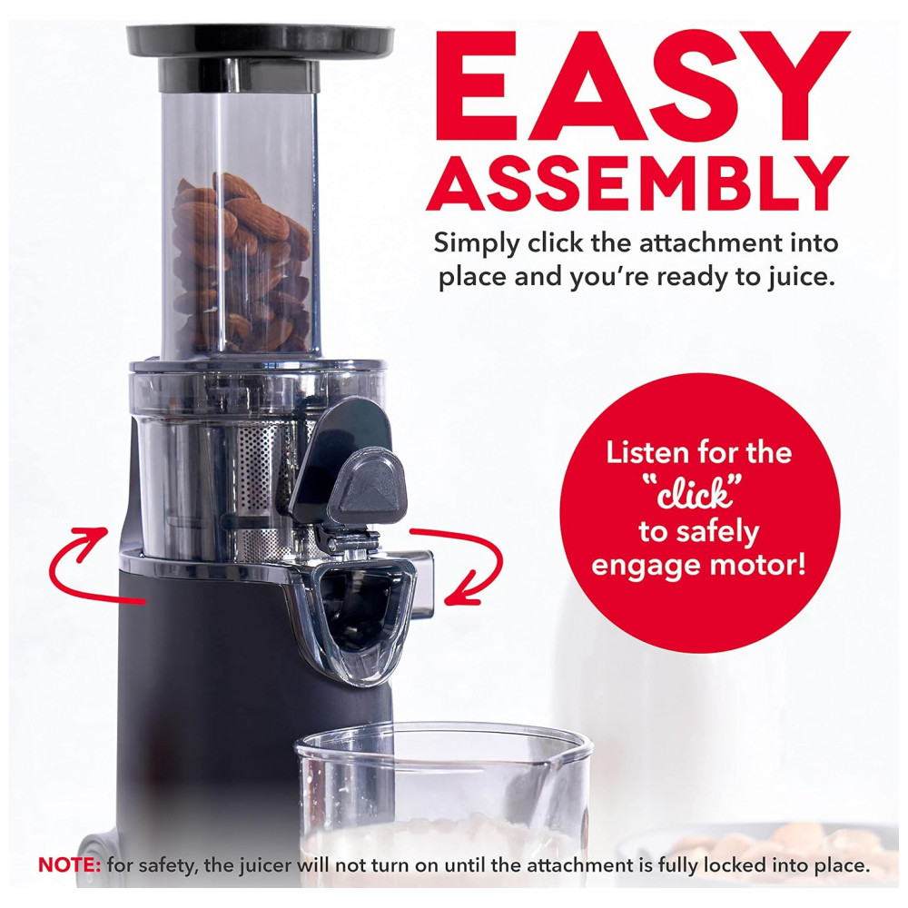 FAÇA SUCOS SAUDÁVEIS E DELICIOSOS O potente motor de 130 Watts extrai a quantidade máxima de nutrientes, vitaminas, sabor e suco de quantidades mínimas de frutas, vegetais, folhas verdes, nozes e grama de trigo.