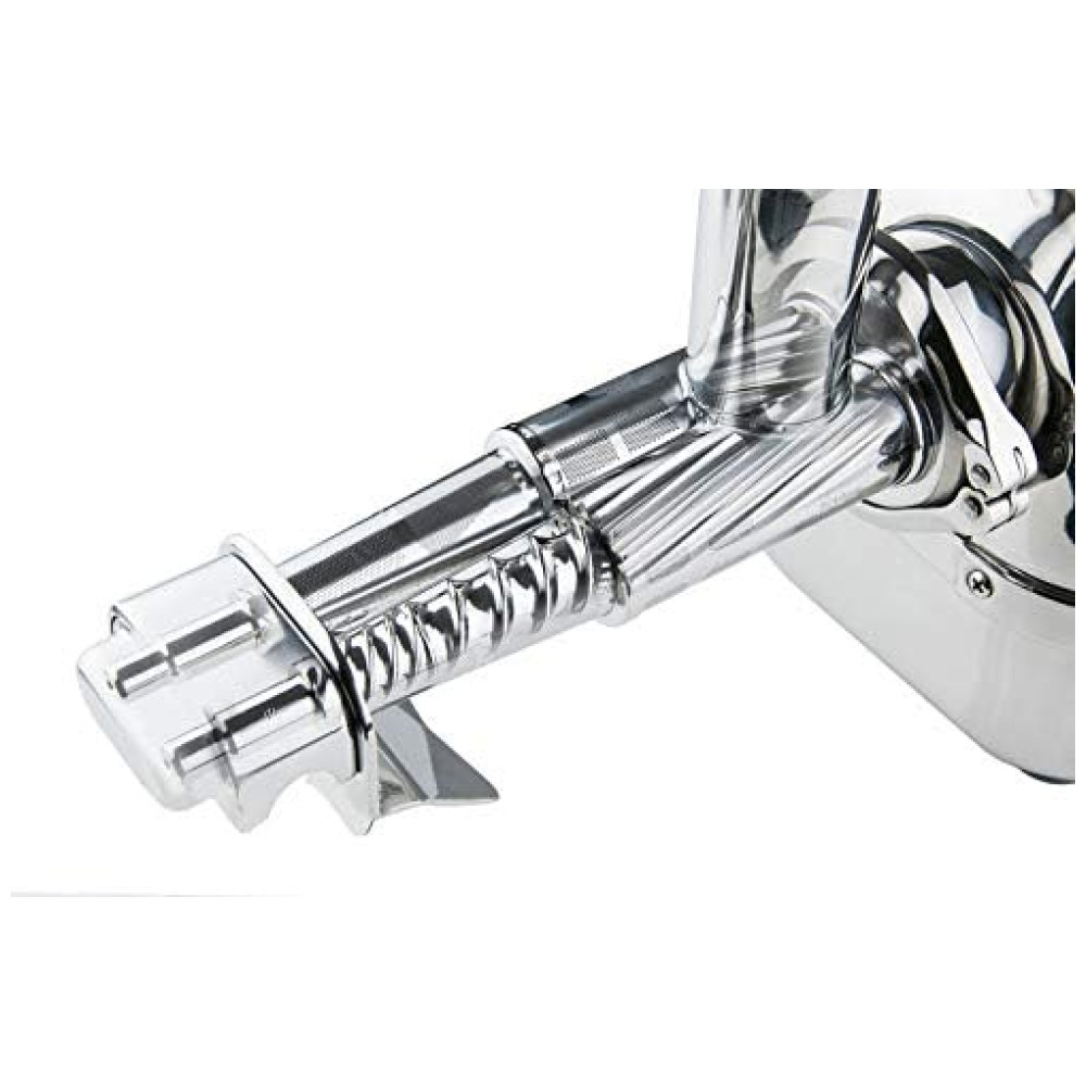 Suco de longa duração A prensagem a frio com o potente motor de 3 cavalos e 86 rpm garante atrito mínimo e evita o acúmulo de calor. Há pouco oxigênio no fluido, resultando em um belo suco vivo sem polpa, que pode ser zenado por até 48 horas na geladeira