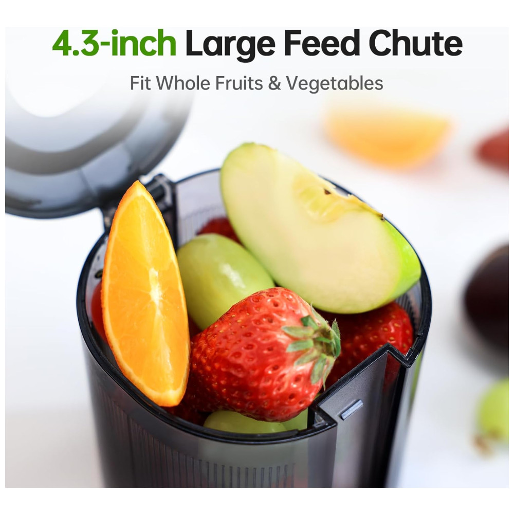 Esta máquina espremedora de vegetais e frutas apresenta uma rampa de alimentação grande de 10 cm, permitindo a extração de suco de frutas e vegetais inteiros, economizando tempo na preparação. Com tecnologia de prensagem lenta a frio, ela extrai um alto rendimento de nutrientes e suco, proporcionando uma experiência de suco verdadeiramente satisfatória.