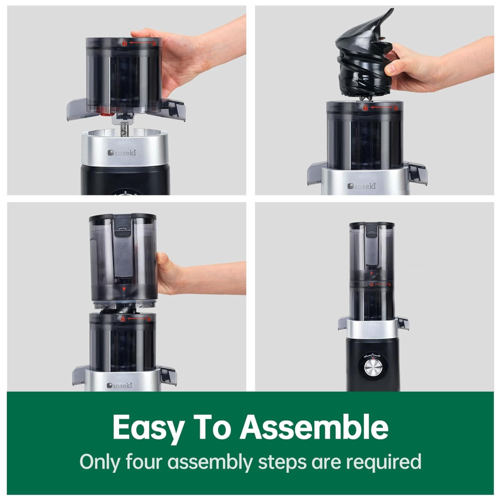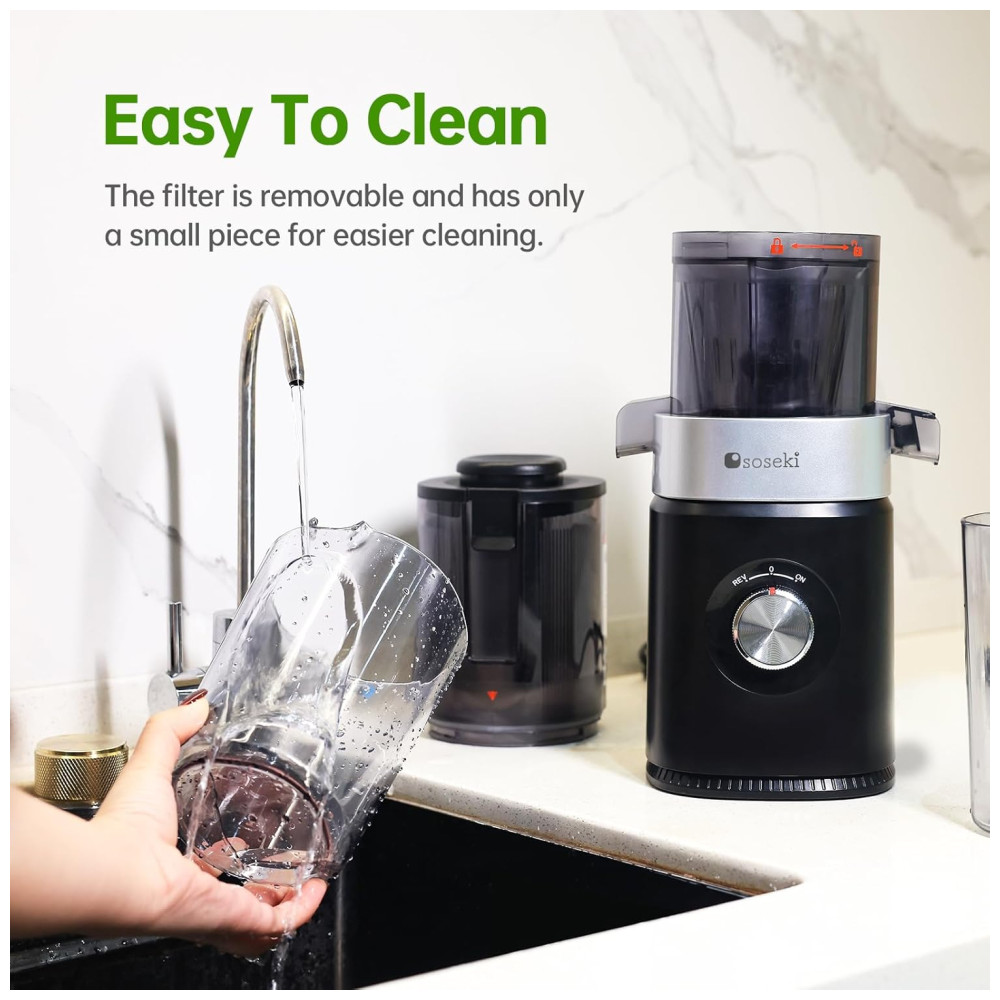 Além disso, foi projetada para fácil montagem e limpeza, com todas as peças, exceto a base de alimentação, podendo ser lavadas com água e o filtro removível simplificando a limpeza. A escova incluída garante uma limpeza eficiente. Para garantir sua segurança, o espremedor a frio para de funcionar automaticamente quando a tampa da calha de alimentação é deixada aberta.