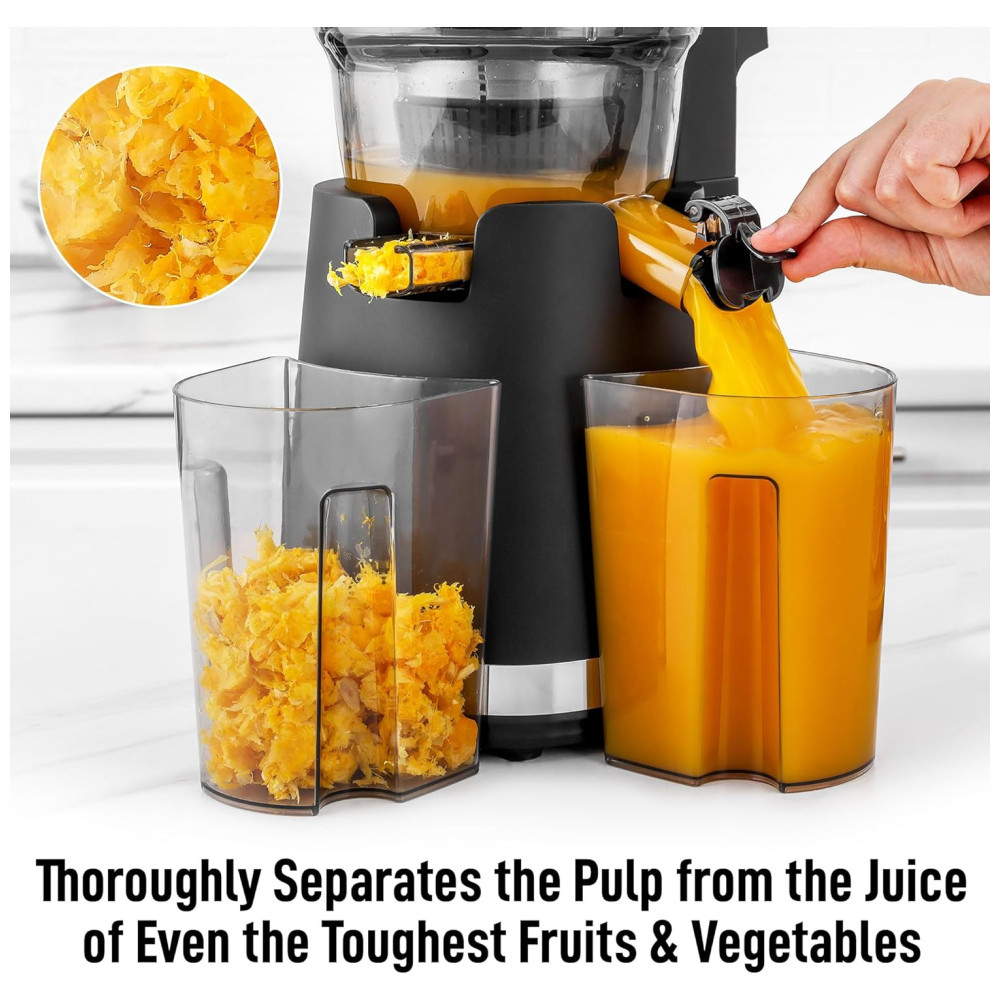 Projetamos nossa máquina de suco com bicos separados de suco e polpa para lhe dar um copo de suco livre de quaisquer sedimentos. Ela também vem com potes de suco e bagaço de 800 ml. O bico de suco tem uma tampa anti gotejamento para fazer suco sem bagunça e reter até a última gota de suco.