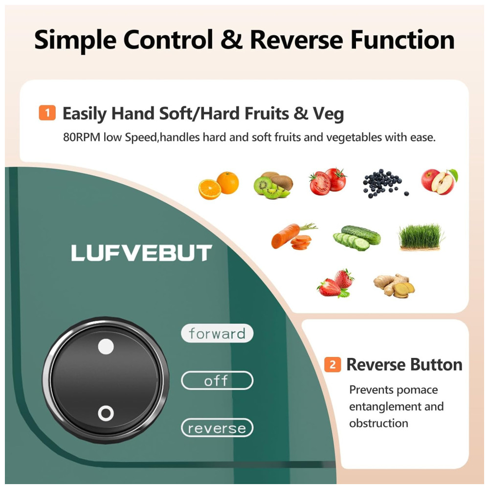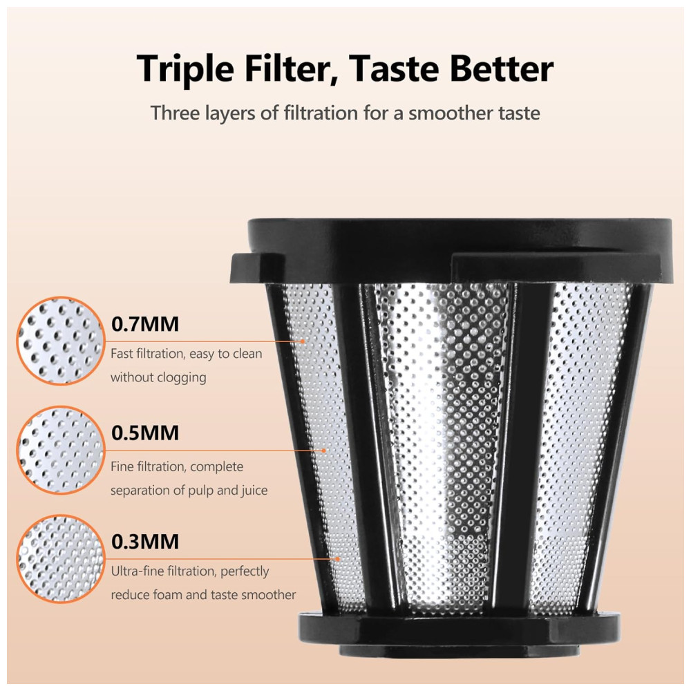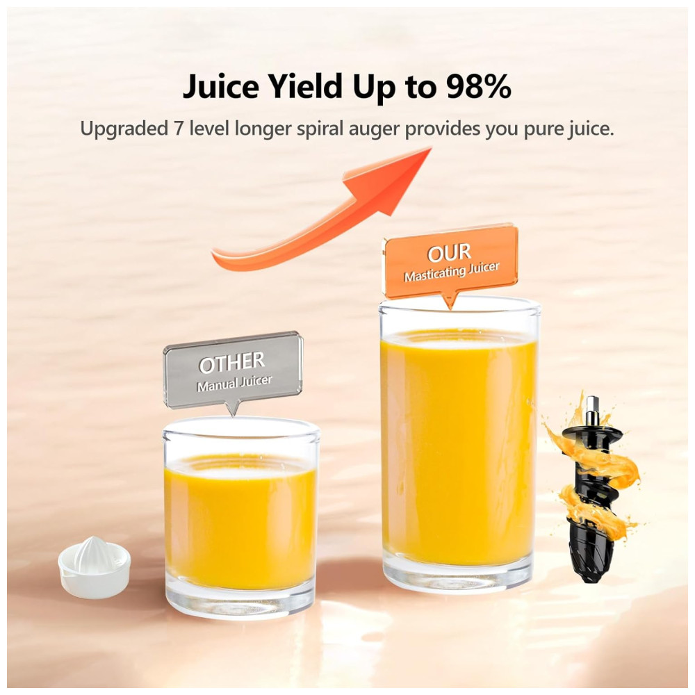 Espremedor de frutas e vegetais com design helicoidal de baixa velocidade de 80 RPM, que preserva as enzimas e nutrientes importantes. Possui controle Onespeed para manusear frutas e vegetais macios e duros, especialmente verduras folhosas. O espremedor lento extrai sucos com sabor rico e mantém o sabor original. Atualizado em 2022, o extrator de suco possui um sistema de mastigação de trado de 7 segmentos e melhor filtro, extraindo o máximo de suco de vegetais e frutas em 7 etapas.