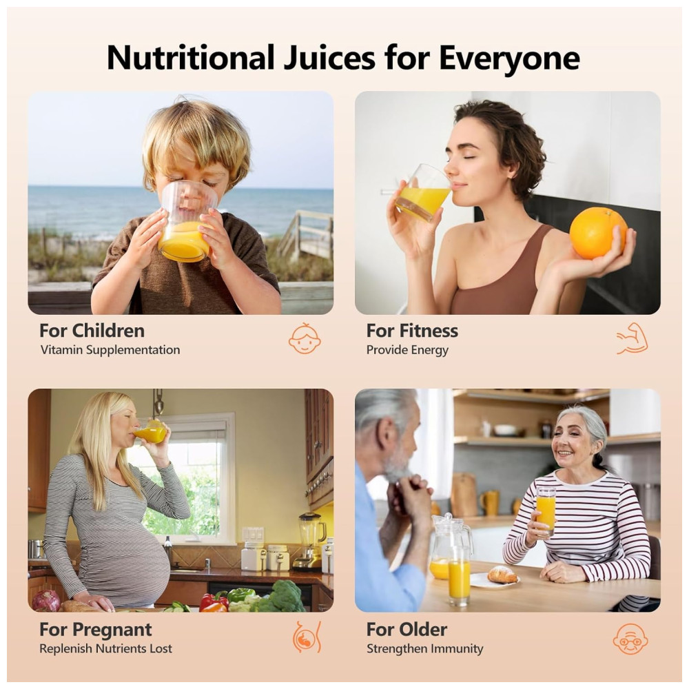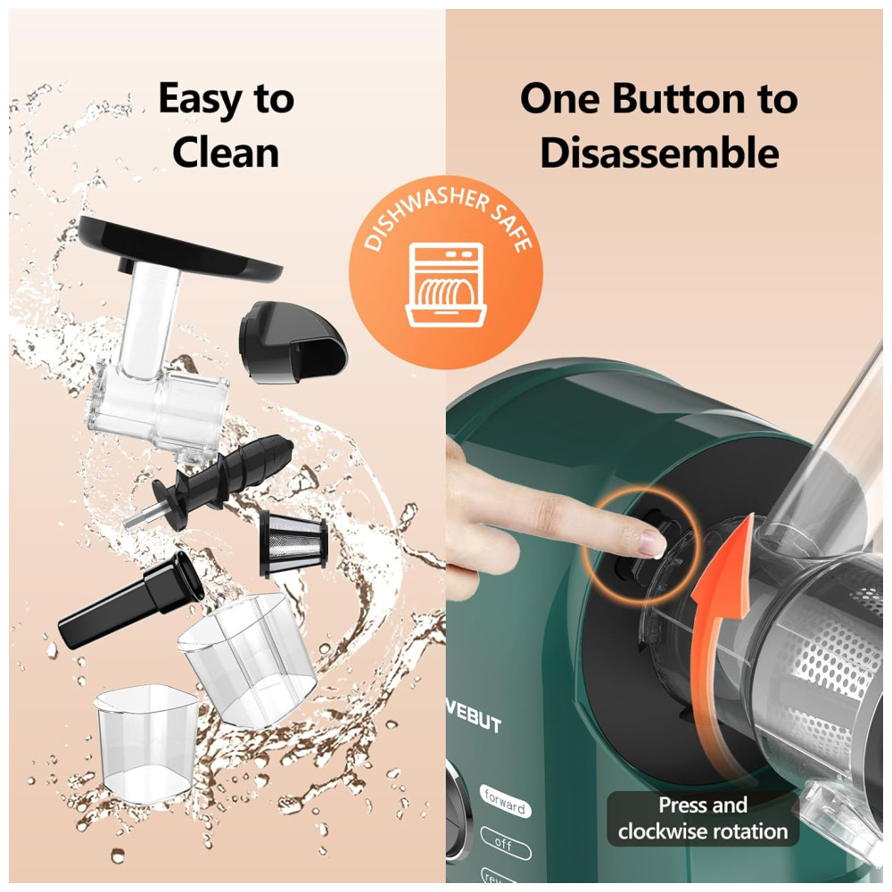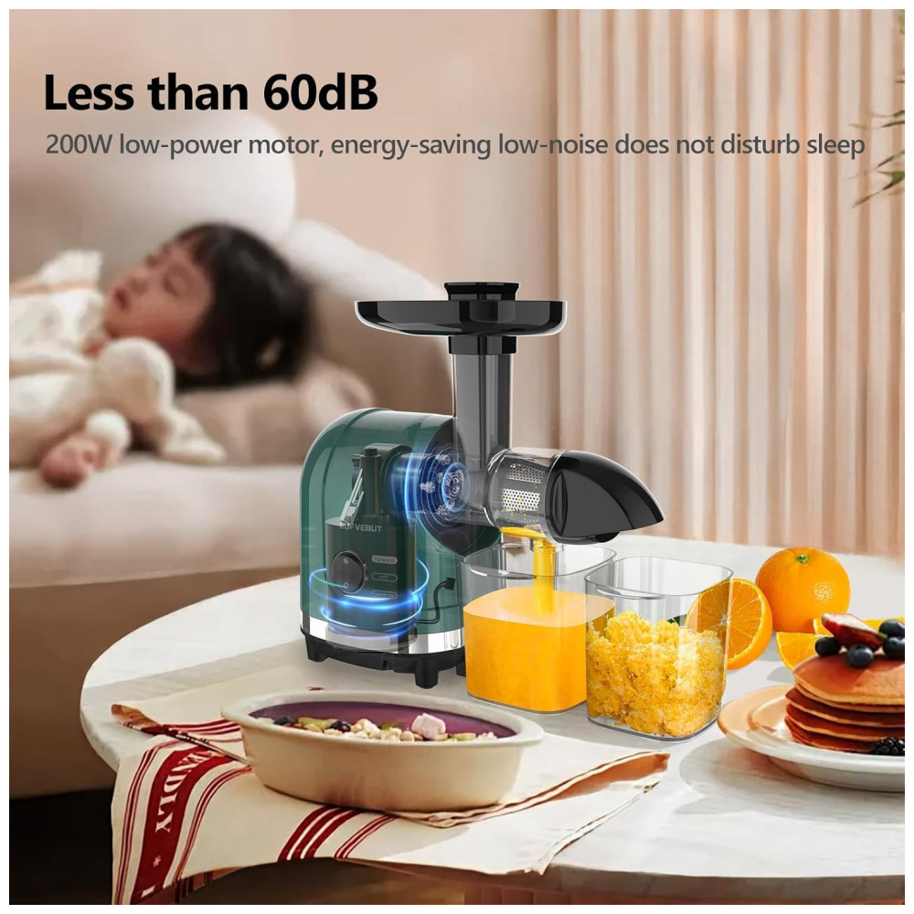 Todas as peças destacáveis são feitas de matéria prima de alta qualidade, sem BPA, seguras para uso a longo prazo. O motor de 200 W é potente para fazer suco de maçã, aipo, laranja, salsa, espinafre, couve, grama de trigo, beterraba e cenoura. Montagem com um clique, sem necessidade de ferramentas. Motor silencioso e design horizontal robusto.