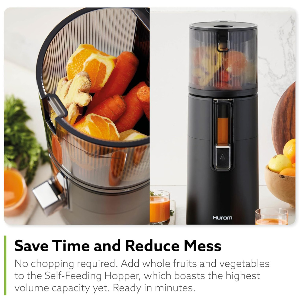 O Hurom H400 é fácil de limpar, graças ao seu revolucionário conjunto de câmaras sem filtro, que garante uma experiência de limpeza sem esfrega e sem polpa entupida. O motor silencioso permite que você comece o dia sem causar agitação e o funil de alimentação automática maximizado permite que você coloque mais ingredientes sem cortá los para uma preparação mínima.