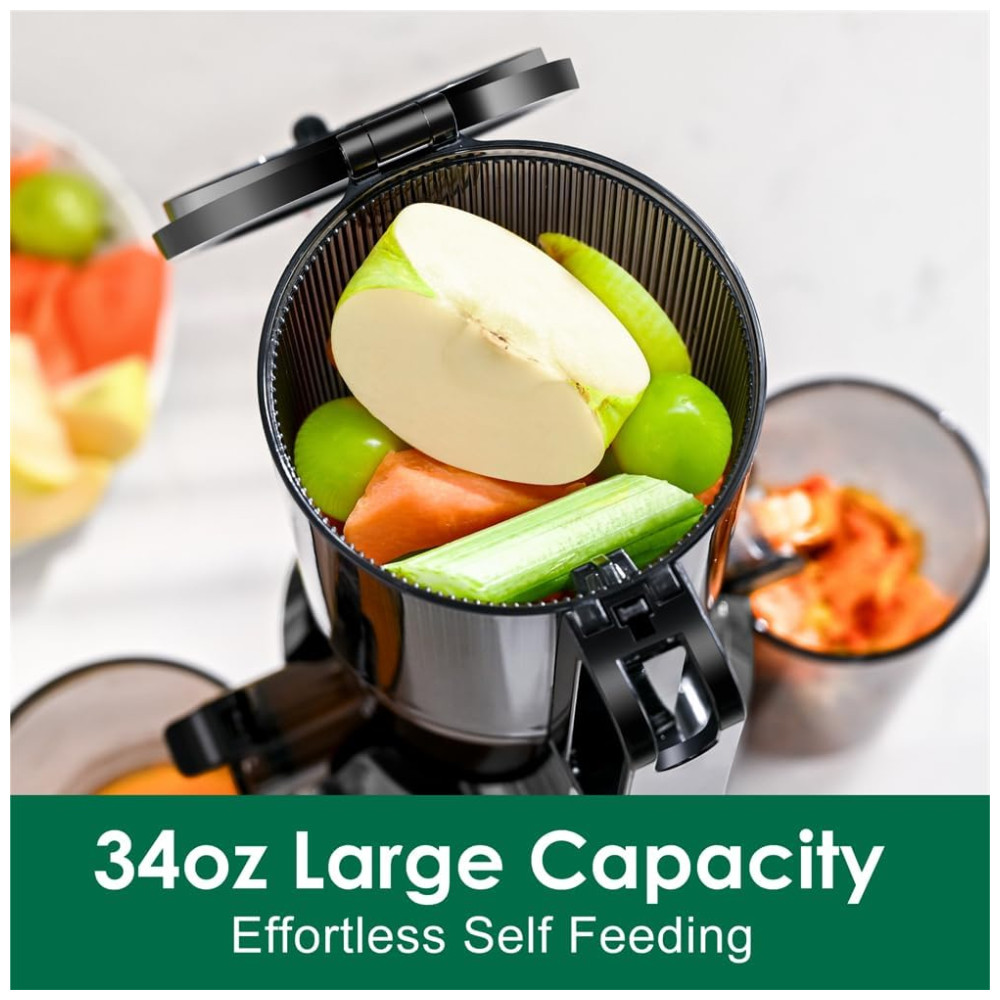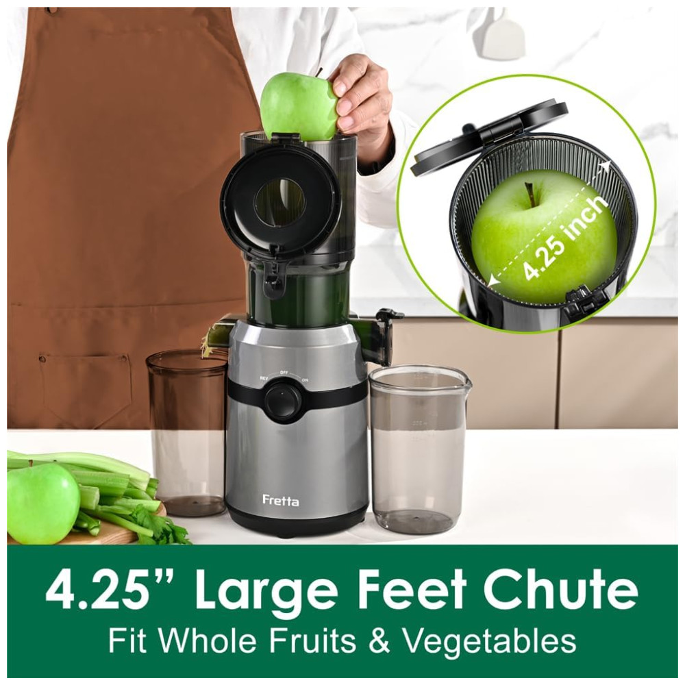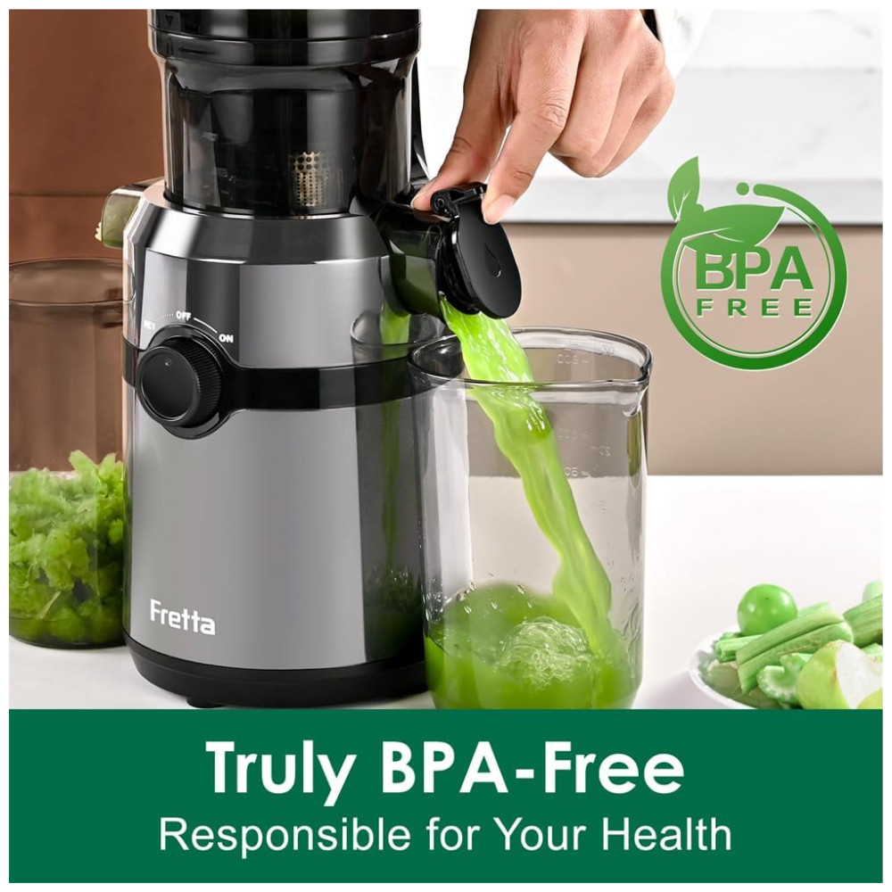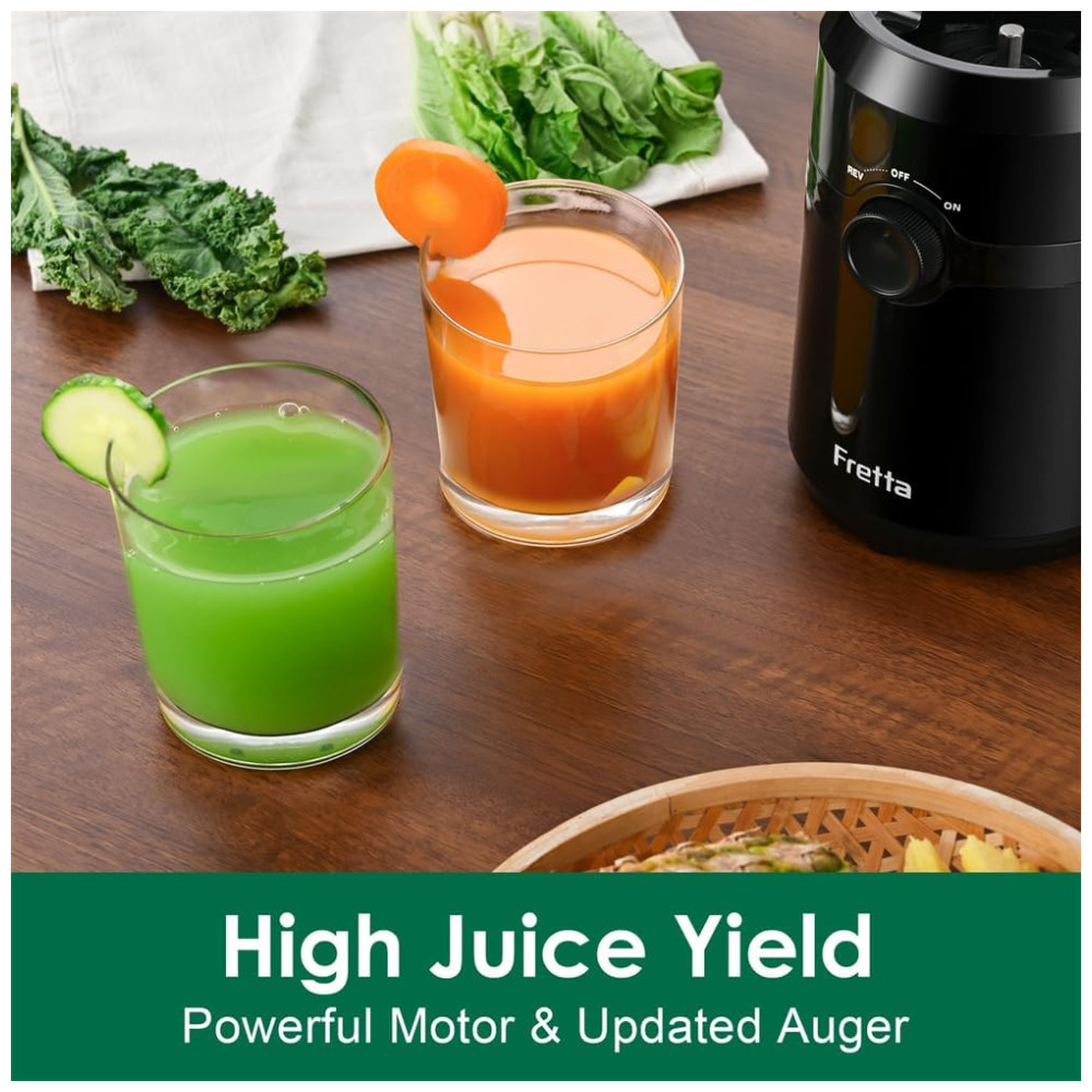 A máquina espremedora Fretta apresenta uma grande capacidade para suco de receita inteira, com uma rampa de alimentação maior de 10 cm que permite adicionar maçãs inteiras, vegetais cortados e ingredientes longos e fibrosos diretamente na rampa de alimentação. O design de alimentação automática permite obter uma xícara fresca de suco WholeRecipe facilmente, com um alto rendimento de vitaminas, nutrientes e suco. A hélice de parafuso do espremedor lento é feita de material Tritan, conhecido por sua tenacidade, resistência ao desgaste e propriedades anticorrosivas, o que permite que o espremedor possa esmagar diferentes tipos de frutas e vegetais.