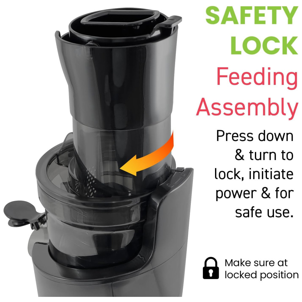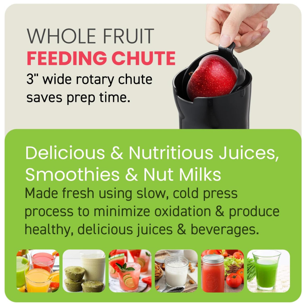 O motor de 200 watts se autoajusta e fornece 40 a 60 rpm enquanto extrai silenciosamente mais suco de frutas e vegetais do que espremedores centrífugos, resultando em mais nutrientes, mais fibras e mais suco por ciclo. O processo lento e consistente de uma prensa a frio, espremedor mastigador, resulta na retenção de mais fibras, nutrientes e enzimas no suco, produzindo uma bebida mais saudável e nutritiva que oxida mais lentamente.