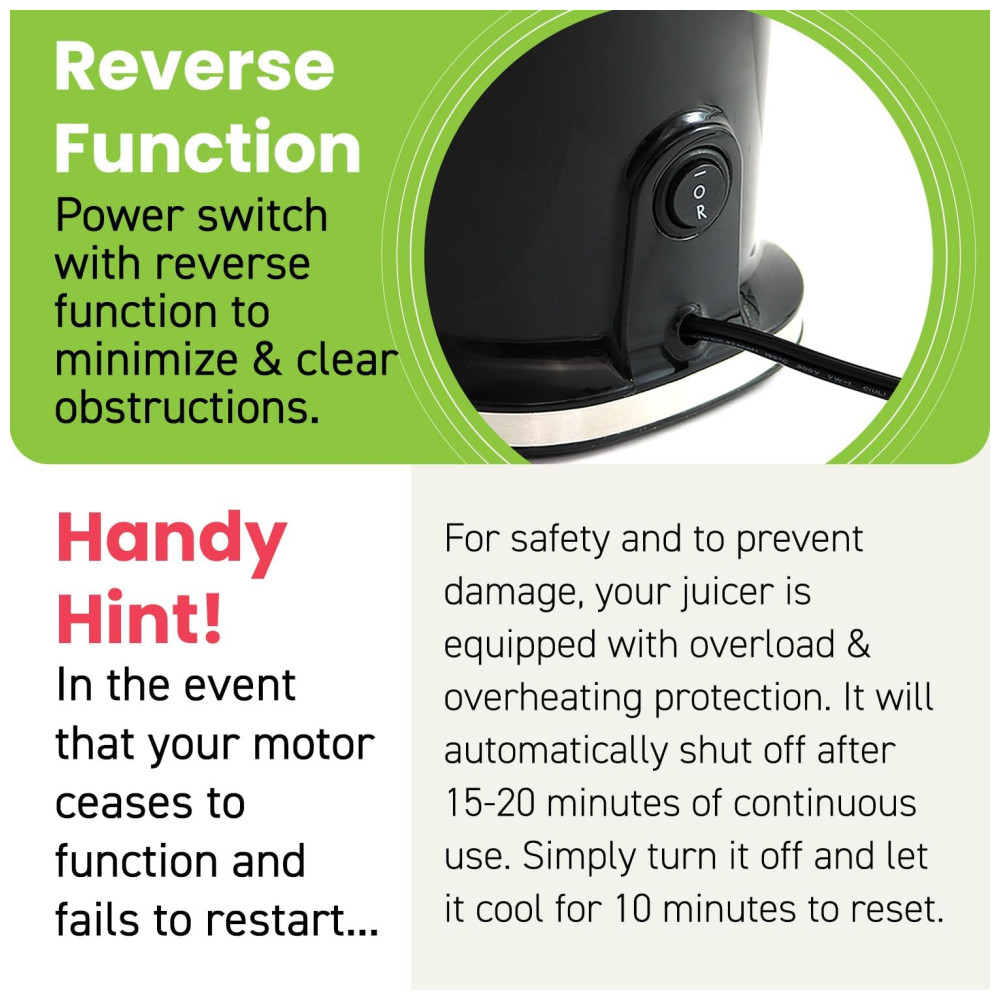 O único sem fim gira lentamente para comprimir e espremer as frutas e legumes para maximizar a produção de suco. O suco resultante produzido tem uma vida útil mais longa do que o suco produzido por espremedores convencionais que usam lâminas de alta velocidade que produzem calor que reduz a produção de fibras nutritivas. Use a função reversa para reduzir e limpar quaisquer obstruções ou bloqueios que possam ocorrer no espremedor.
