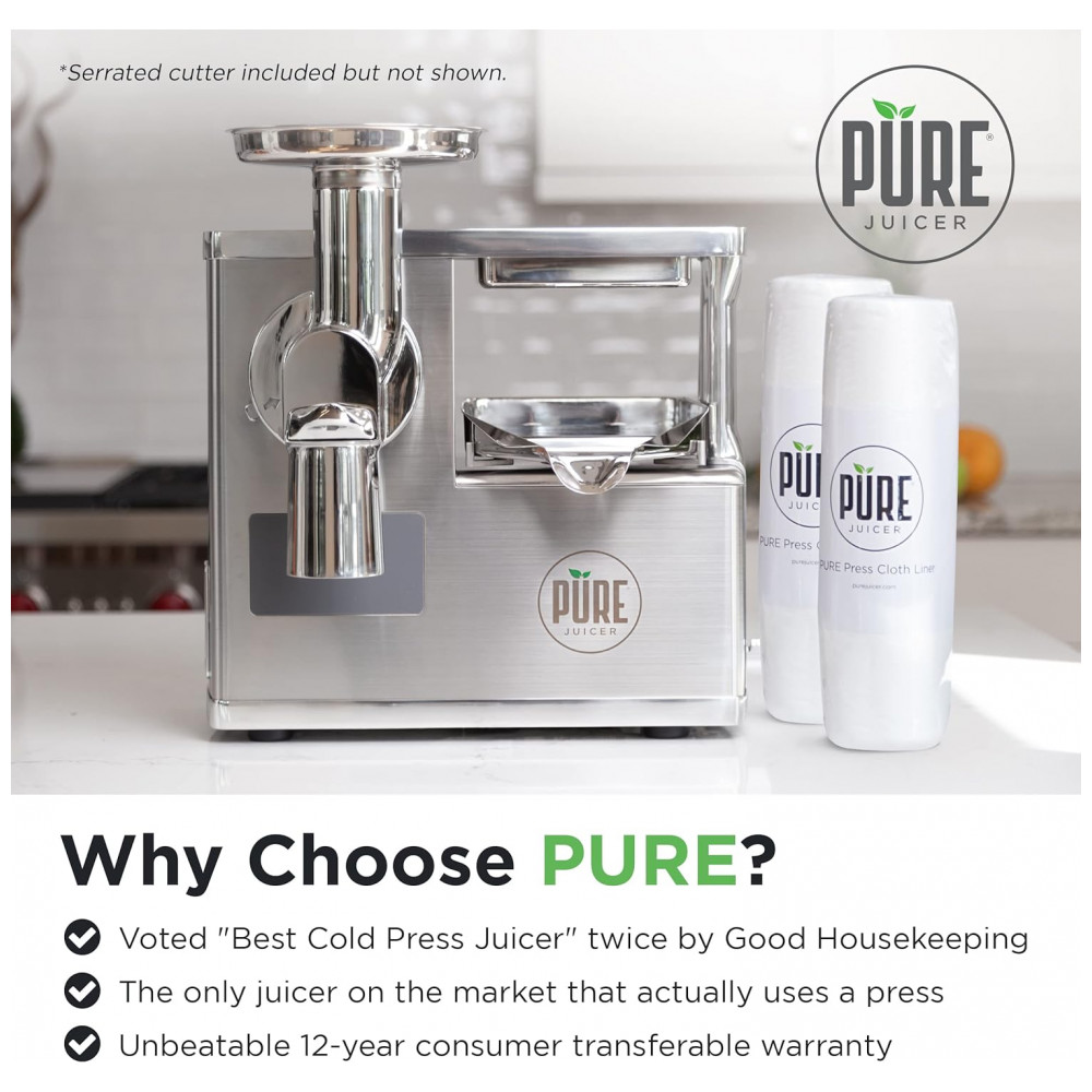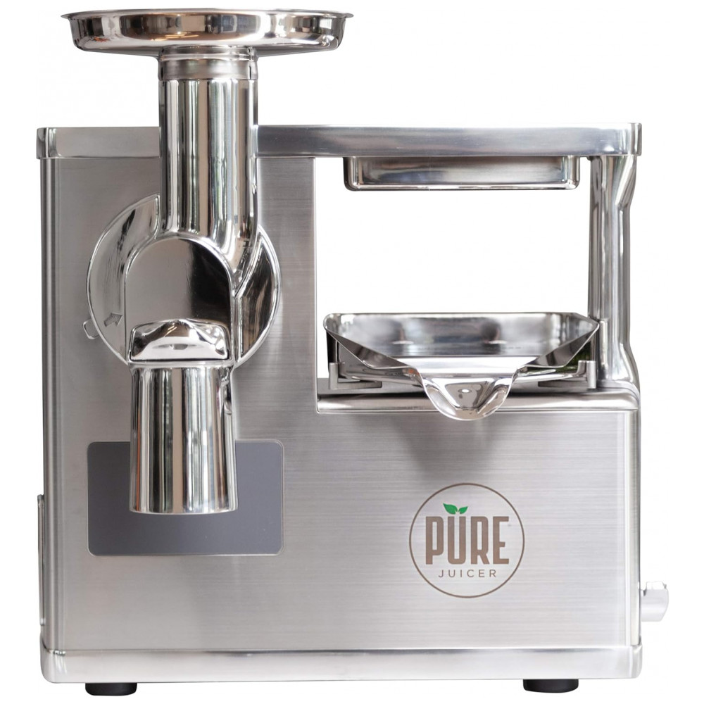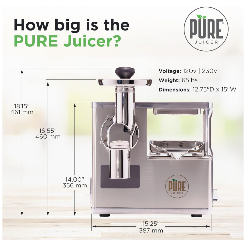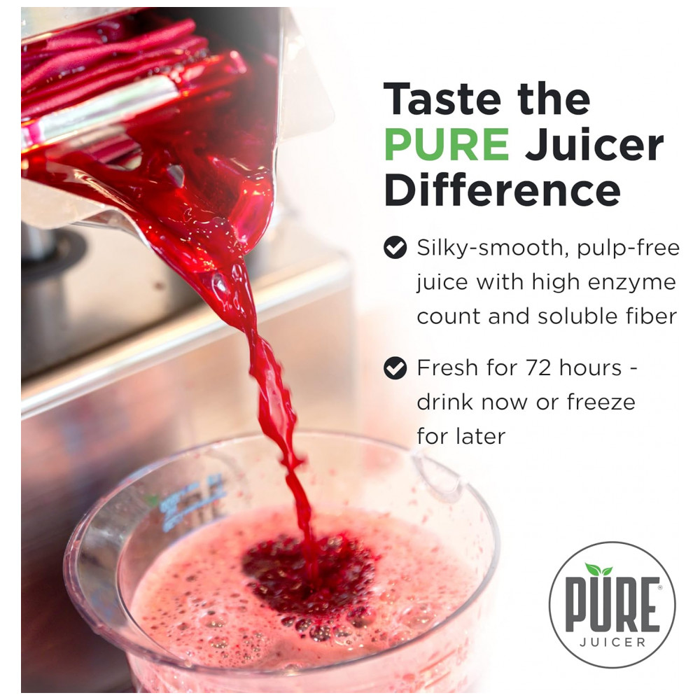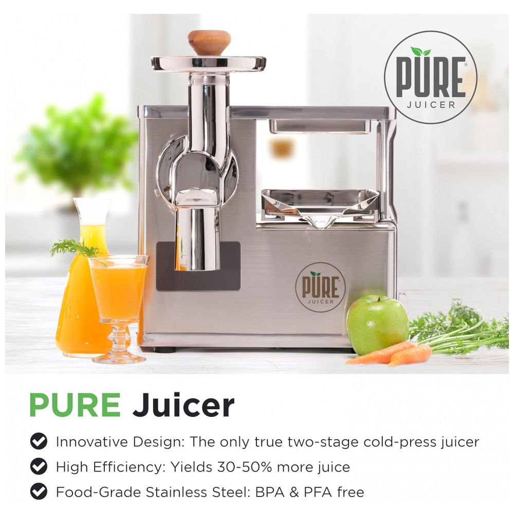 PURE JUICER Nosso espremedor de aço inoxidável usa um processo exclusivo de prensa a frio de dois estágios. Ele moe rapidamente o produto em uma polpa fina e usa uma poderosa prensa hidráulica para extrair cada gota vital de suco. A polpa é ótima para assar, smoothies e muito mais.