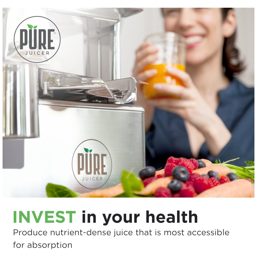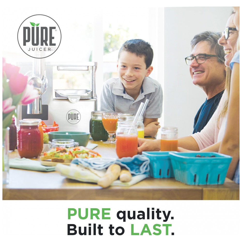 QUALIDADE Projetado com sua saúde em mente, o PURE Juicer usa um design de aço inoxidável e foi projetado para resistir ao teste do tempo