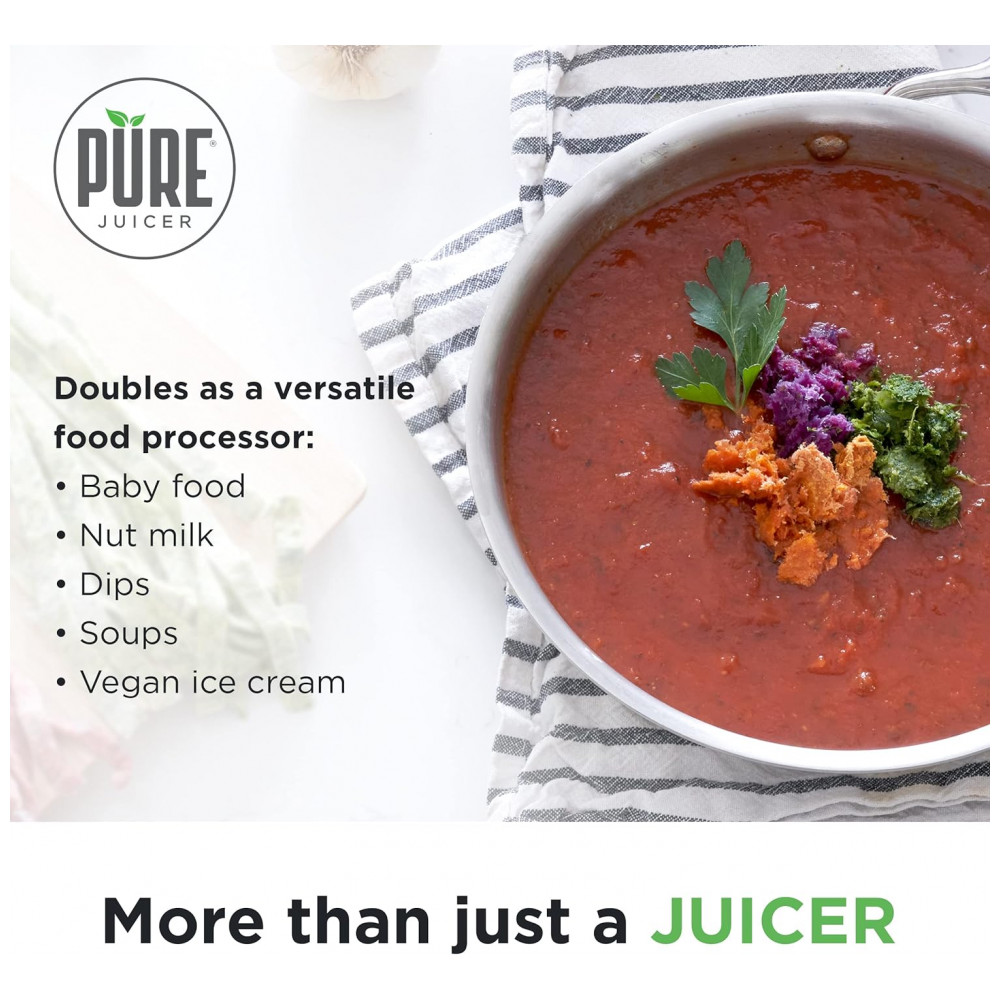 SAÚDE O espremedor de primeira linha da PUREs produz sucos e alimentos com nutrientes densos. Nossa máquina de espremedor é versátil e funciona como um excelente processador de alimentos para fazer comida para bebê, leite de noz, molhos, sopas e até sorvete vegano. Comida saudável e deliciosa para sua família.