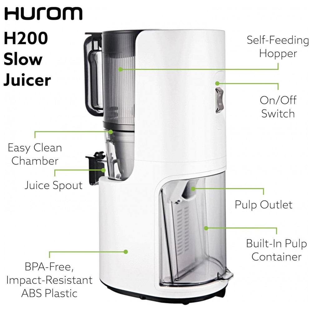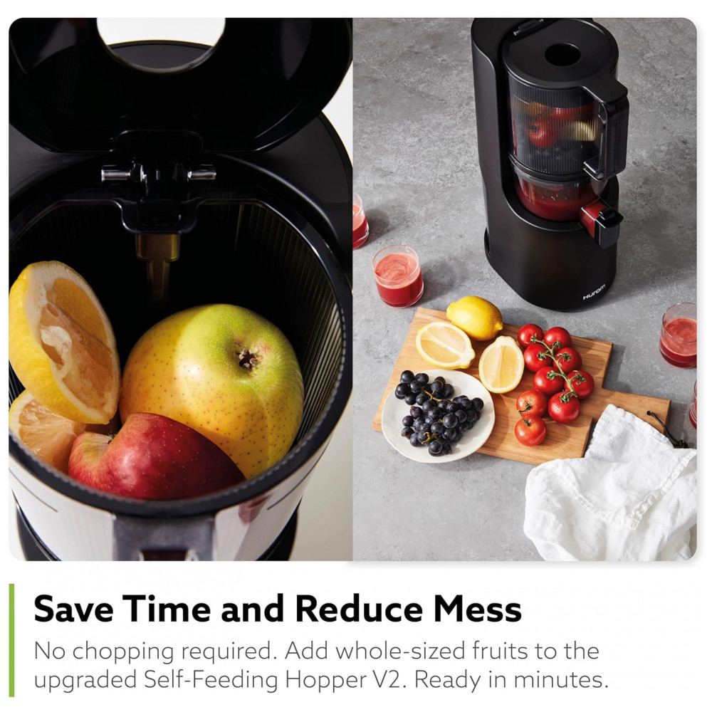 Hopper V2 com alimentação própria O H200 Slow Juicer vem com uma tremonha de alimentação automática atualizada que tem uma boca maior e está equipada com uma entrada para adicionar mais ingredientes enquanto o espremedor ainda está funcionando.