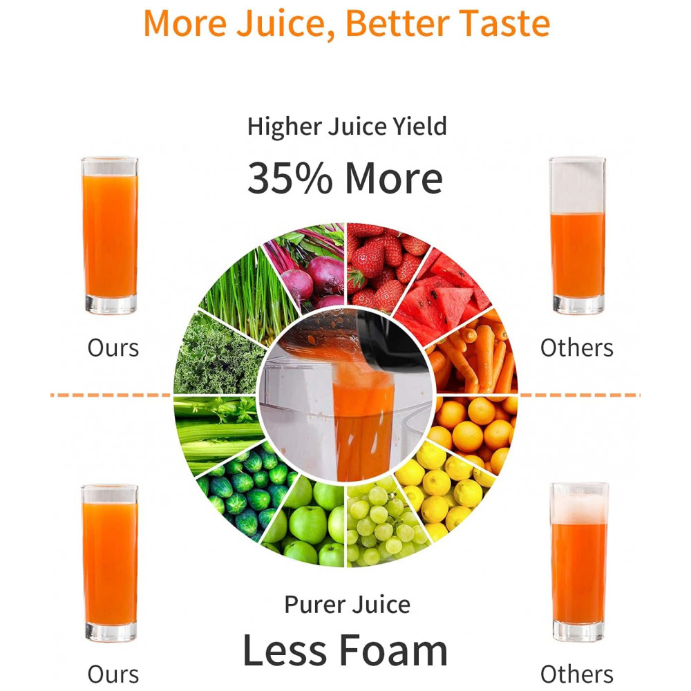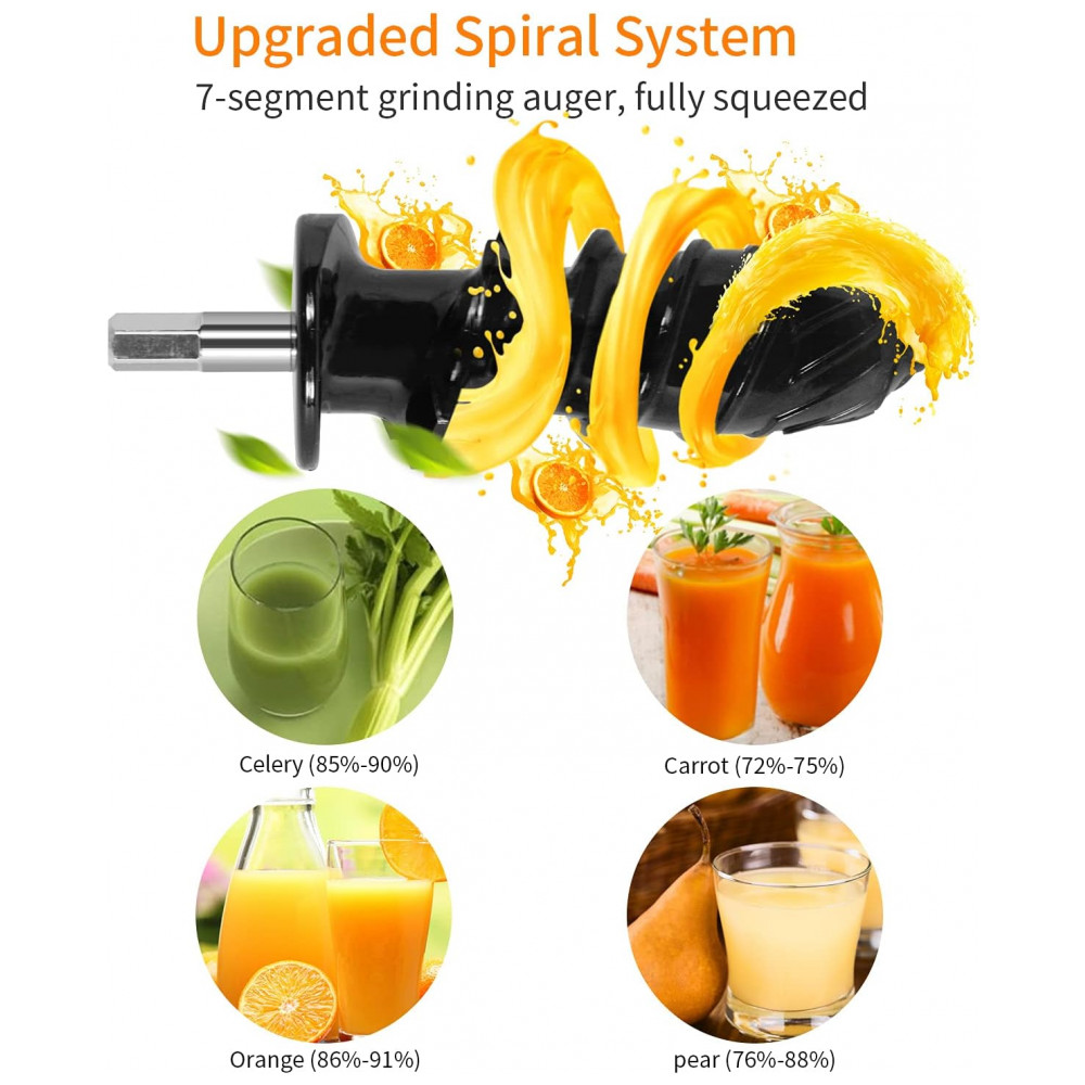 Rendimento real de alto suco Seu espremedor pessoal usa a tecnologia de prensa a frio que funciona em velocidades muito mais lentas para espremer frutas e legumes. Sistema espiral de mastigação de 7 segmentos, corte, quebra e, moer e extrair mais suco, do abacaxi ao gengibre. Furos na tela de filtro fino de 3 estágios, coe o suco extraído novamente. Este espremedor bem projetado fornecerá maior rendimento de suco, polpa mais seca e suco mais suave e menos espumoso. A velocidade mais lenta e a falta de calor o tornam mais silencioso do que os modelos centrífugos.