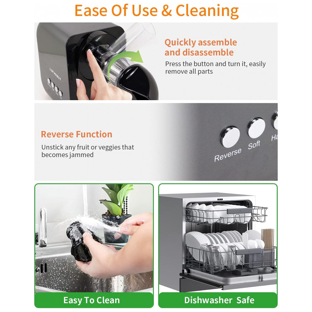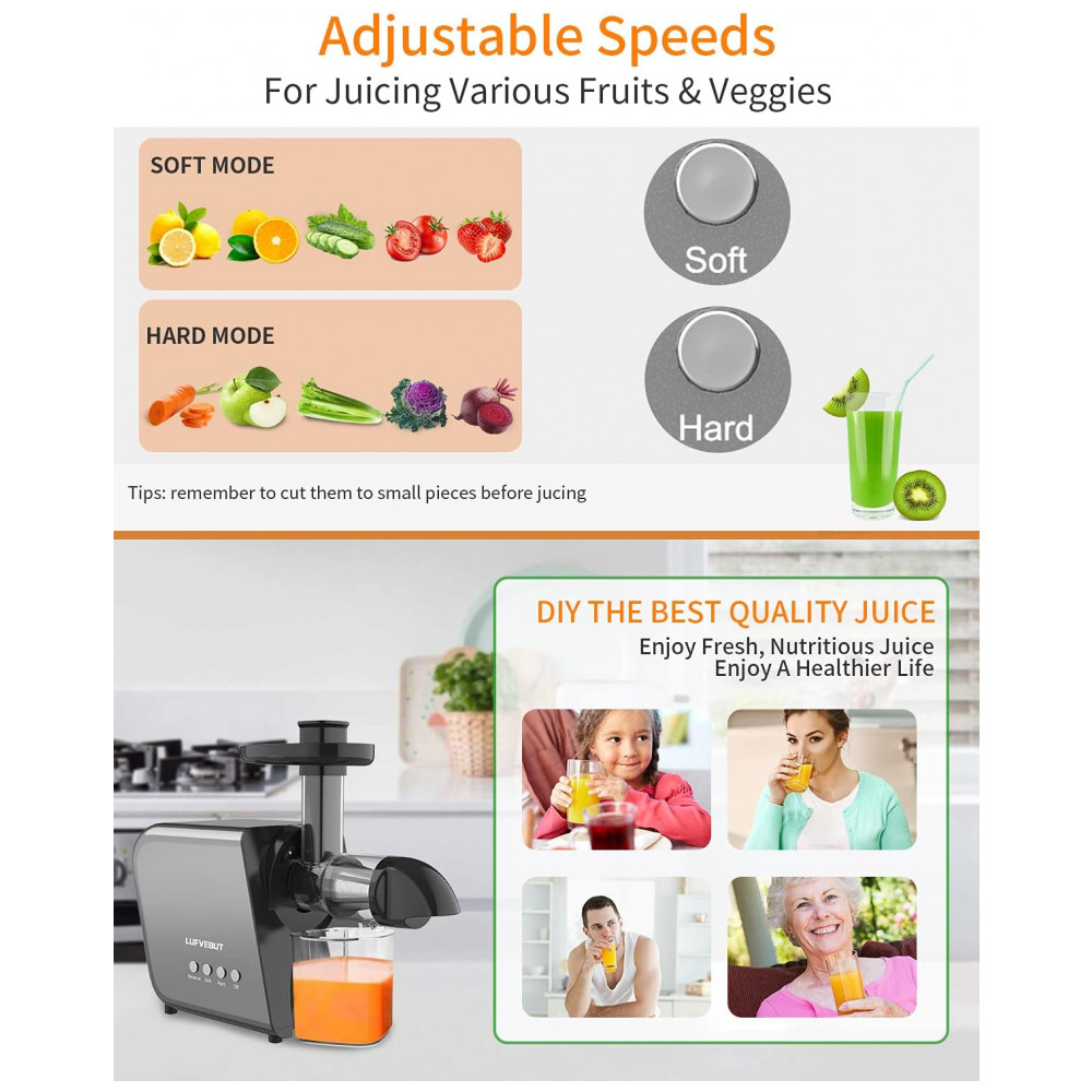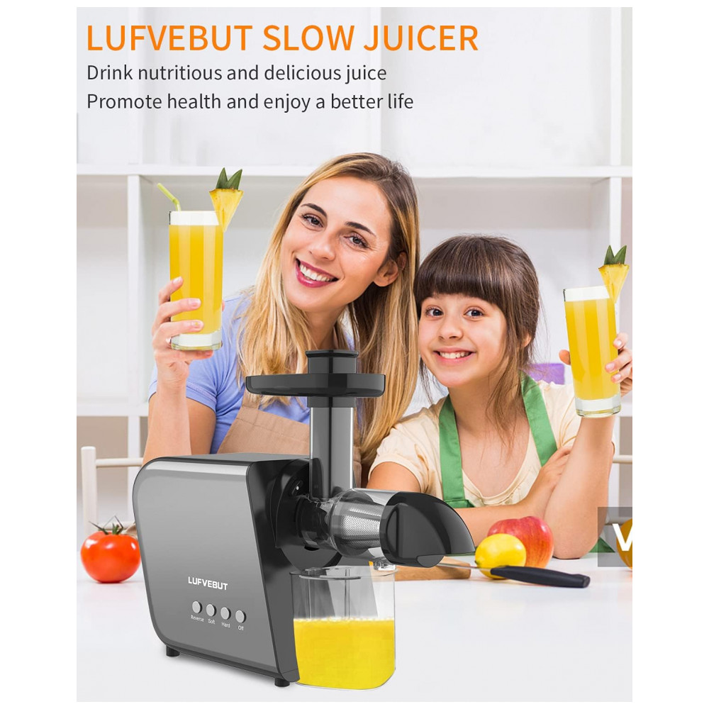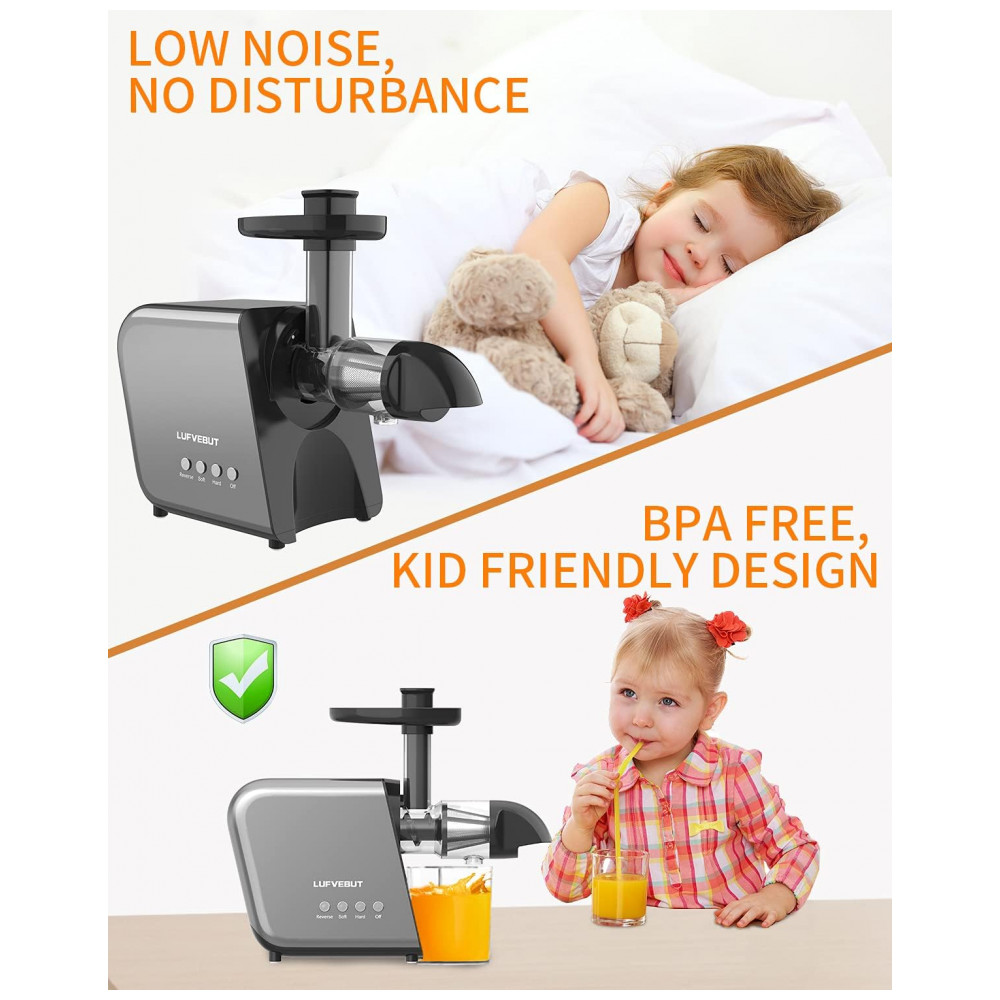 Tenha os sucos mais nutritivos LUFVEBUT lentamente adotam motor sem escova de cobre de alto torque de 250W, ingredientes fáceis de espremer e macios, menos de 80rpm, sem danos às células de suco, reduza o ar no suco, reduza a oxidação, mais delicioso sistema de sucos atualizado, a distância entre o trado e a tela do filtro é reduzida, mais de 40 menor que a distância de prensagem comum do produto, para que o suco tenha um sabor mais delicado e mais retenção de nutrientes.